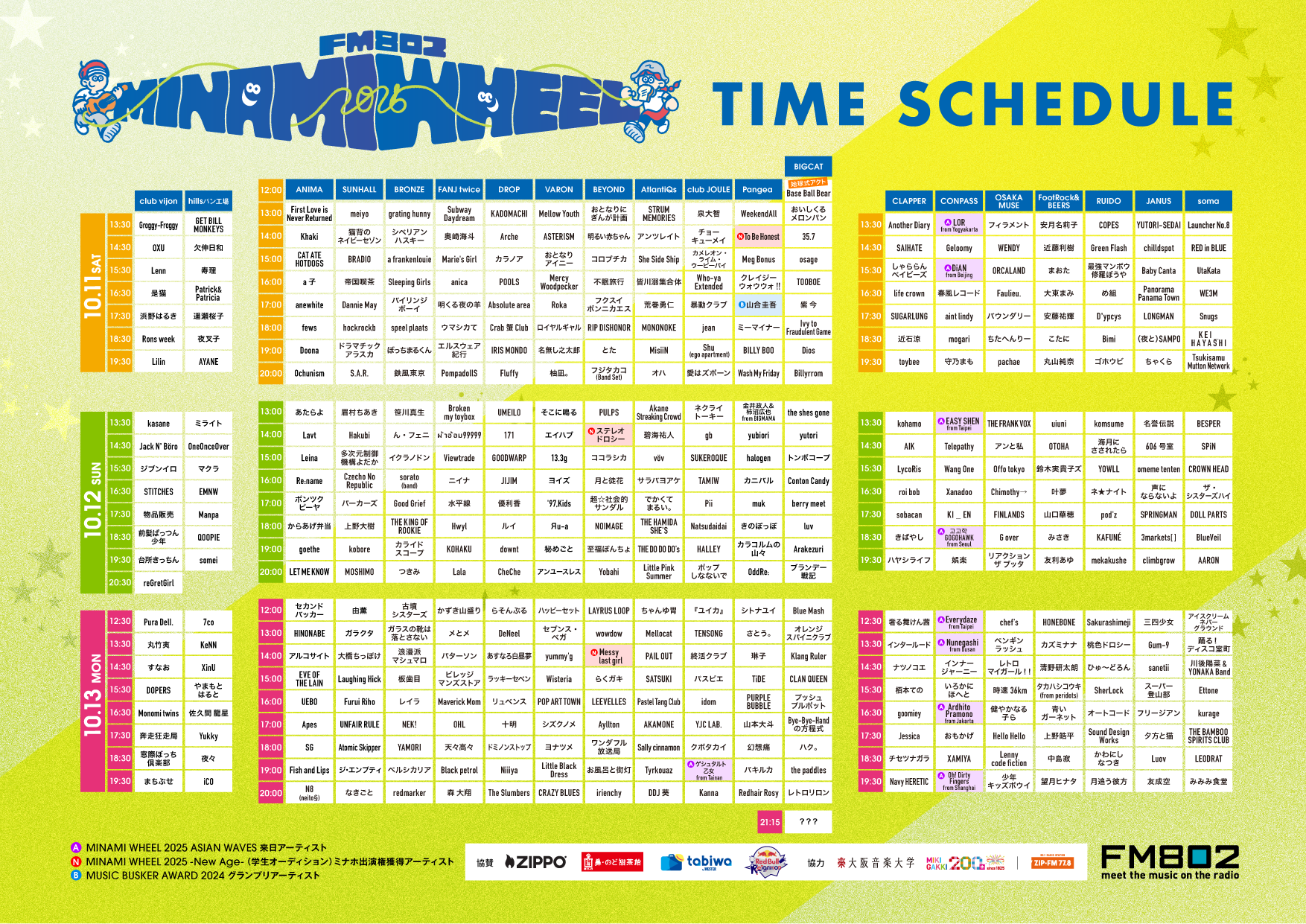 ANIMA / AtlantiQs / BEYOND / BIGCAT / BRONZE / CLAPPER / club JOULE / club vijon / CONPASS / DROP / FANJ twice / FootRock&BEERS / hills パン工場 / JANUS / OSAKA MUSE / OSAKA RUIDO / Pangea / soma / SUNHALL / VARON / なんばHatch(11日・12日のみ)