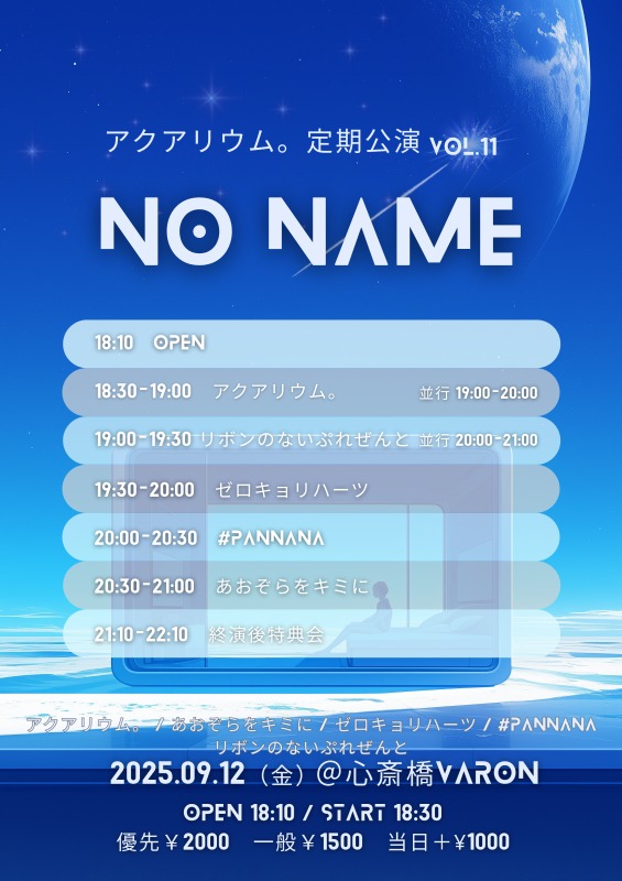 心斎橋 VARON(ヴァロン) スケジュール 2025.9.12(Fri) アクアリウム。定期公演vol.11「no name」 [ACT] アクアリウム。 / あおぞらをキミに / #PANnana / ゼロキョリハーツ / リボンのないぷれぜんと [OPEN/START] 18:10/18:30 [料金] 優先 ¥2,000 / 一般 ¥1,500 (+1D) ※当日券は各+¥1,000(1D別) (問)心斎橋VARON 06-6243-1400 / info@osaka-varon.jp チケットURL →https://t.livepocket.jp/e/ns5vt