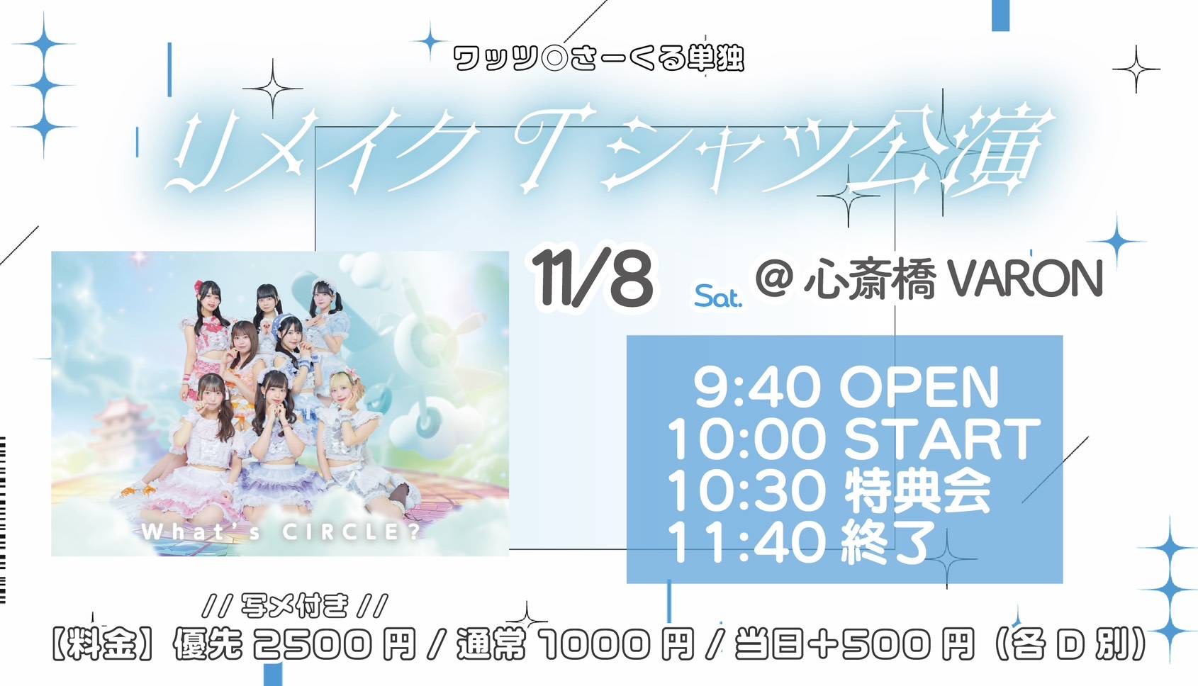 心斎橋 VARON(ヴァロン) スケジュール 2025.11.08(Sat) 「#ワッくるのリメイクTシャツ単独公演」 [ACT] ワッツ◎さーくる [OPEN/START] 9:40/10:00 [料金] 優先 2500円/通常1000円/当日+500円(D別) (問)心斎橋VARON 06-6243-1400 / info@osaka-varon.jp 11/5(水)23:00チケ発 https://t.livepocket.jp/e/varon1108
