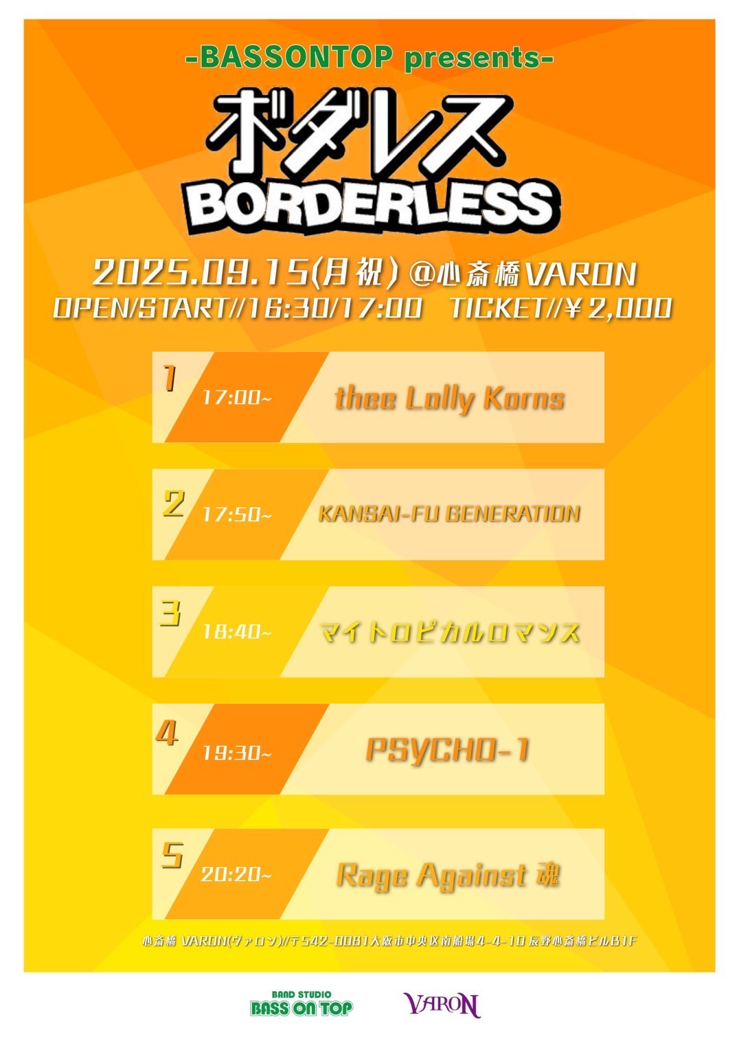 心斎橋 VARON(ヴァロン) スケジュール 2025.9.15(Mon) BASS ON TOP presents「ボダレス BORDERLESS」 [ACT] three Lolly Korns / KANSAI-FU GENERATION / マイトロピカルロマンス / PSYCHO-1 / Rage Against 魂 [OPEN/START] 16:30/17:00 [料金] Door Only ¥2,000 (+1Drink¥700) (問)心斎橋VARON 06-6243-1400 / info@osaka-varon.jp