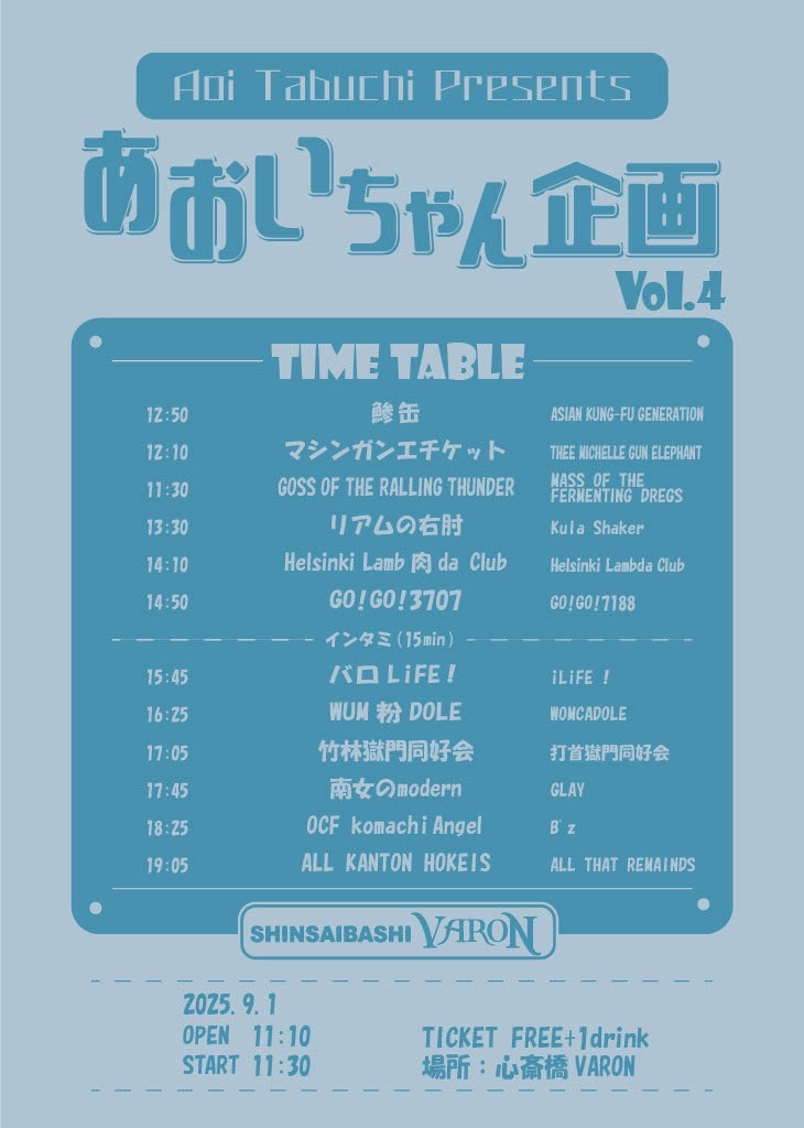 心斎橋 VARON(ヴァロン) スケジュール 2025.9.01(Mon) あおいちゃん企画 vol.4 [ACT] 鯵缶 / マシンガンエチケット / GOSS OF THE RALLING THUNDER / リアムの右肘 / BAKARABBITS / GO!GO!3707 / バロLiFE!/ WUM粉DOLE / 竹林獄門同好会 / 南女のmodern / OCF komachiAngel / ALL KANTON HOKEIS [OPEN/START] 11:10/11:30 [料金] FREE(+1D¥700) (問)心斎橋VARON 06-6243-1400 / info@osaka-varon.jp