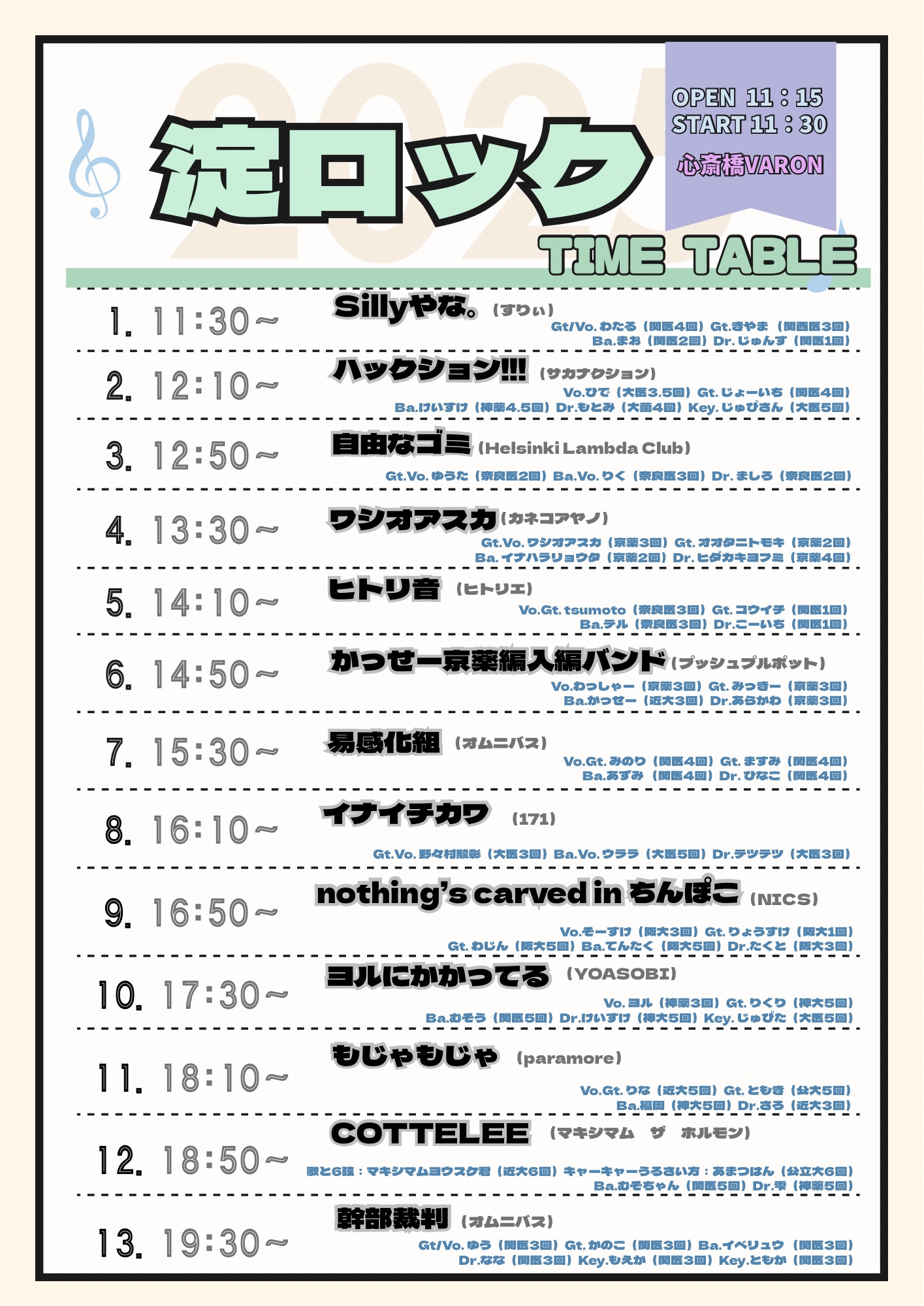 心斎橋 VARON(ヴァロン) スケジュール 2025.11.09(Sun) 淀ロック [ACT] Sillyやな。/ ハックション!!! / 自由なゴミ / ワシオアスカ / ヒトリ音 / かっせー京薬編入バンド / 易感化組 / イナイチカワ / nothing's stone in ちんぽこ / ヨルにかかってる / もじゃもじゃ / COTTELEE / 幹部裁判 [OPEN/START] 11:15/11:30 [料金] 無料(別途1drink代¥700必要) (問)心斎橋VARON 06-6243-1400 / info@osaka-varon.jp