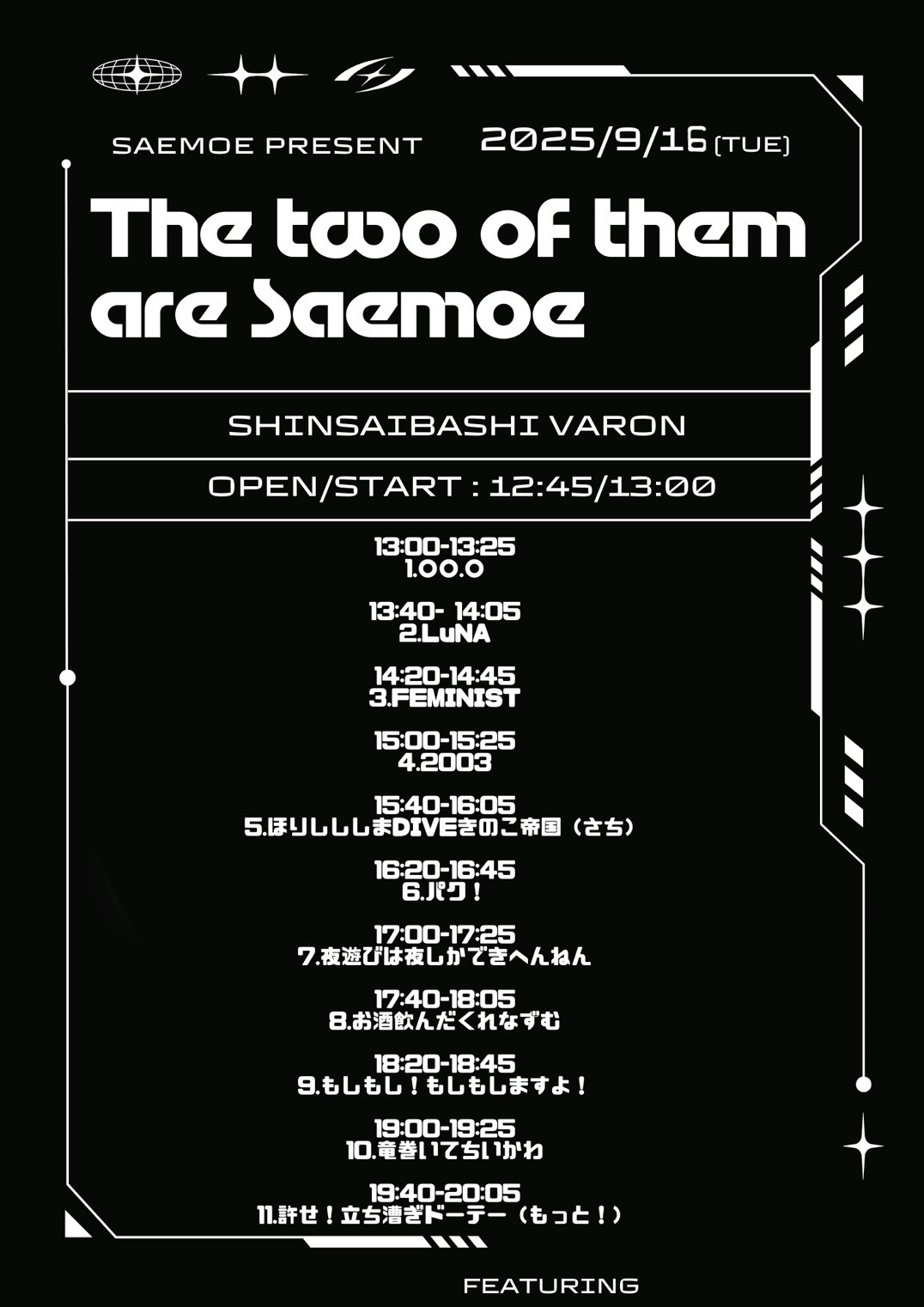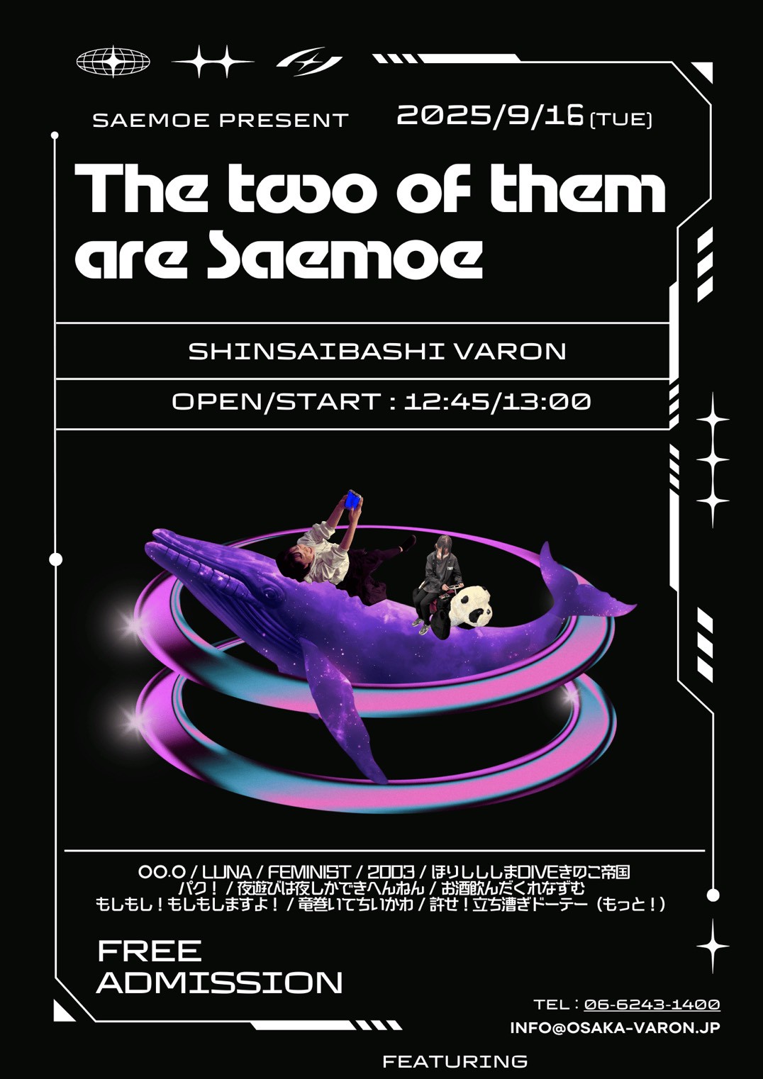 心斎橋 VARON(ヴァロン) スケジュール 2025.9.16(Tue) SAEMOE PREZENT The two of them are Saemoe [ACT] 〇〇.〇 / LuNA / FEMINIST / 2003 / ほりししまDIVEきのこ帝国(さち) / パク! / 夜遊びは夜しかできへんねん / お酒飲んだくれなずむ / もしもし!もしもしますよ! / 竜巻いてちいかわ / 許せ!立ち漕ぎドーテー(もっと!) [OPEN/START] 12:45 / 13:00 [料金] FREE (+1D¥600-) (問)心斎橋VARON 06-6243-1400 / info@osaka-varon.jp