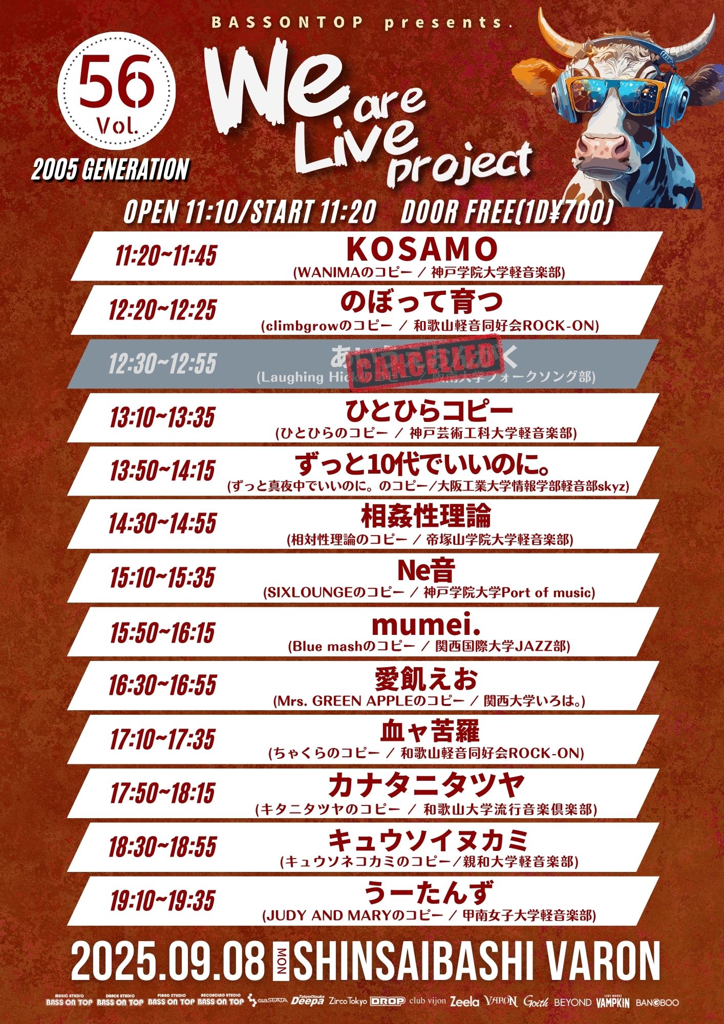 - KOSAMO / のぼって育つ / Ne音 / ひとひらコピー / 相姦性理論 / mumei. / うーたんず / 愛飢えお / 血ャ苦羅 / カナタニタツヤ / キュウソイヌカミ / ずっと10代でいいのに。 / 【出演団体】 甲南女子大学軽音楽部 / 和歌山大学流行音楽倶楽部 / 和歌山軽音同好会ROCK-ON / 帝塚山学院大学軽音楽部 / 神戸学院大学軽音楽部 / 神戸親和大学軽音楽部 / 神戸芸術工科大学軽音楽部 / 関西国際大学JAZZ部 / 関西大学いろは。/ 神戸学院大学Port of music / 大阪工業大学情報学部軽音部sky