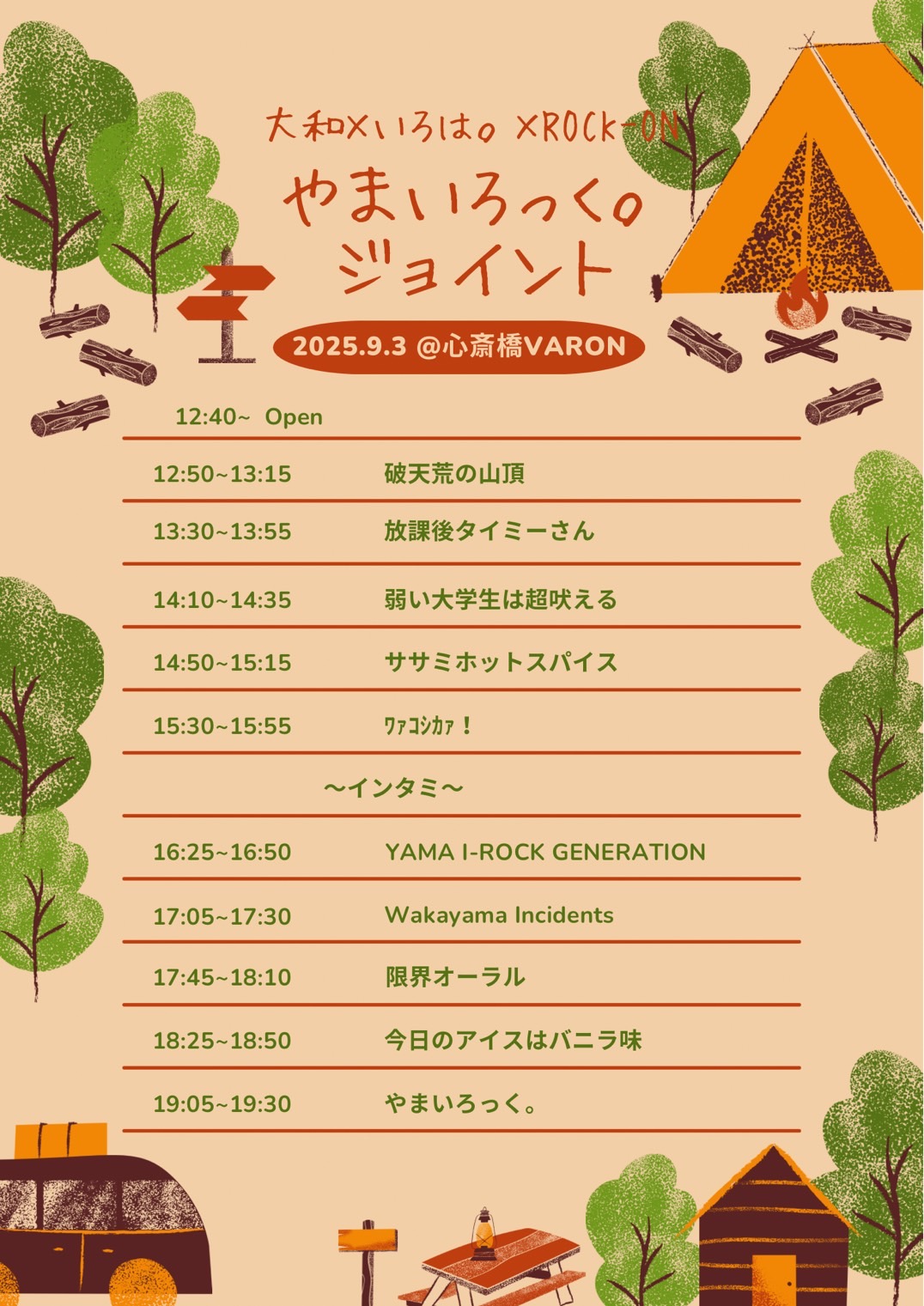 心斎橋 VARON(ヴァロン) スケジュール 2025.9.03(Wed) やまいろっく。 [ACT] 破天荒の山頂 / 放課後タイミーさん / 弱い大学生は超吠える / ササミホットスパイス / ワァコシカァ! / YAMA I-ROCK GENERATION / Wakayama Incidents / 限界オーラル / 今日のアイスはバニラ味 / やまいろっく。 [OPEN/START] 12:40/12:50 [料金] FREE(+1D¥700) (問)心斎橋VARON 06-6243-1400 / info@osaka-varon.jp