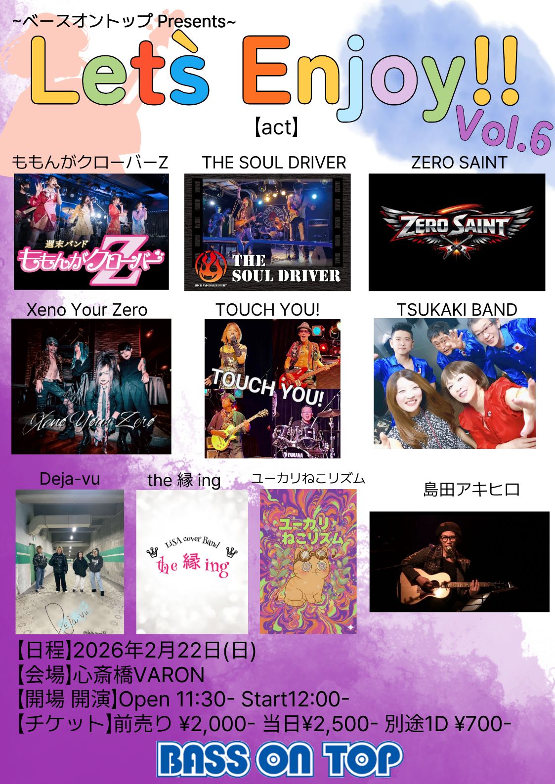 心斎橋 VARON(ヴァロン) スケジュール 2026.2.22(Sun) ベースオントップPresents Let's Enjoy!! vol.6 [ACT] the縁ing / THE SOUL DRIVER / ZERO SAINT / ユーカリねこリズム / ももんがクローバーZ / TSUKAKI BAND / TOUCH YOU! / 島田アキヒロ / Deja-vu / Xeno Your Zero [OPEN/START] 11:30 / 12:00 [料金] ADV/DOOR ¥2,000/¥2,500 (各+1D¥700) (問)心斎橋VARON 06-6243-1400 / info@osaka-varon.jp