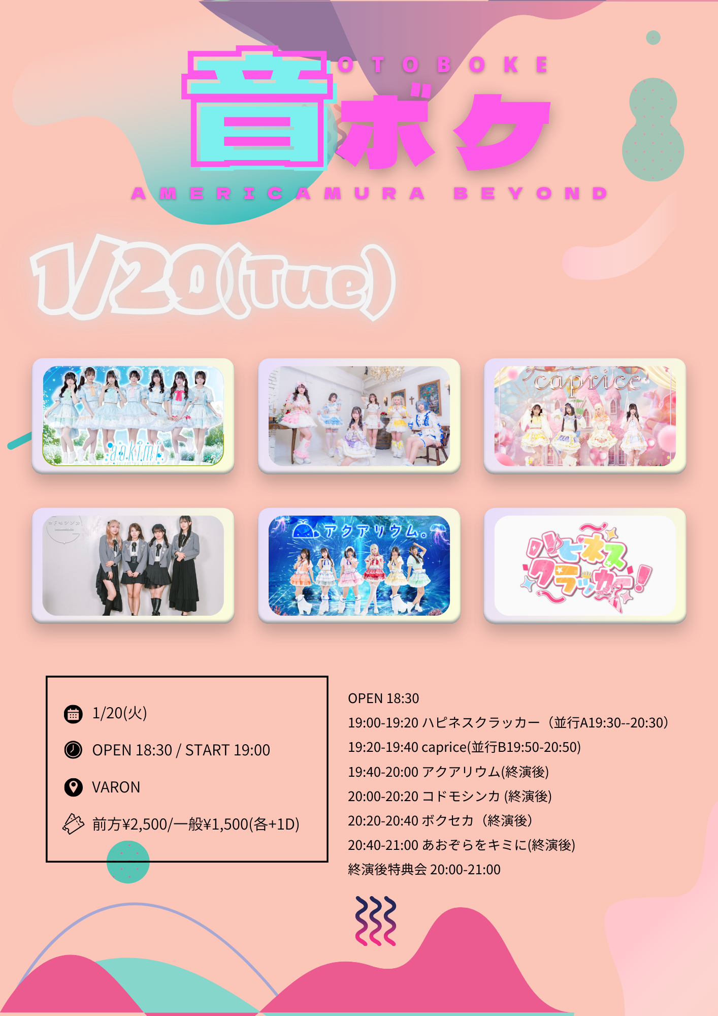 心斎橋 VARON(ヴァロン) スケジュール 2026.1.20(Tue) 音ボケ [ACT] ボクセカ / あおぞらをキミに / caprice / コドモシンカ / ハピネスクラッカー [OPEN/START] 18:30/19:00 [料金] ■前方¥2,500 / 一般チケット ¥1,500 (+1D) ※当日券は各+¥500 (問)心斎橋VARON 06-6243-1400 / info@osaka-varon.jp チケットはこちらから →https://t-dv.com/otoboke_VARON