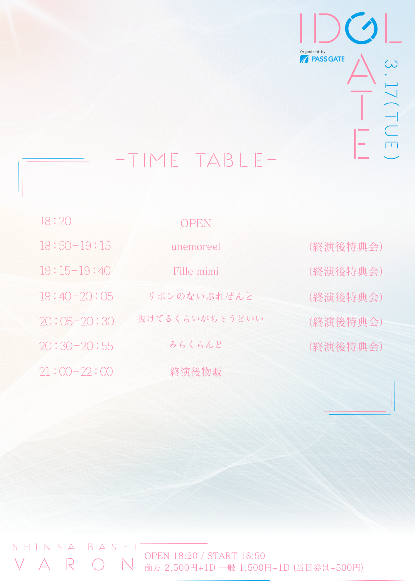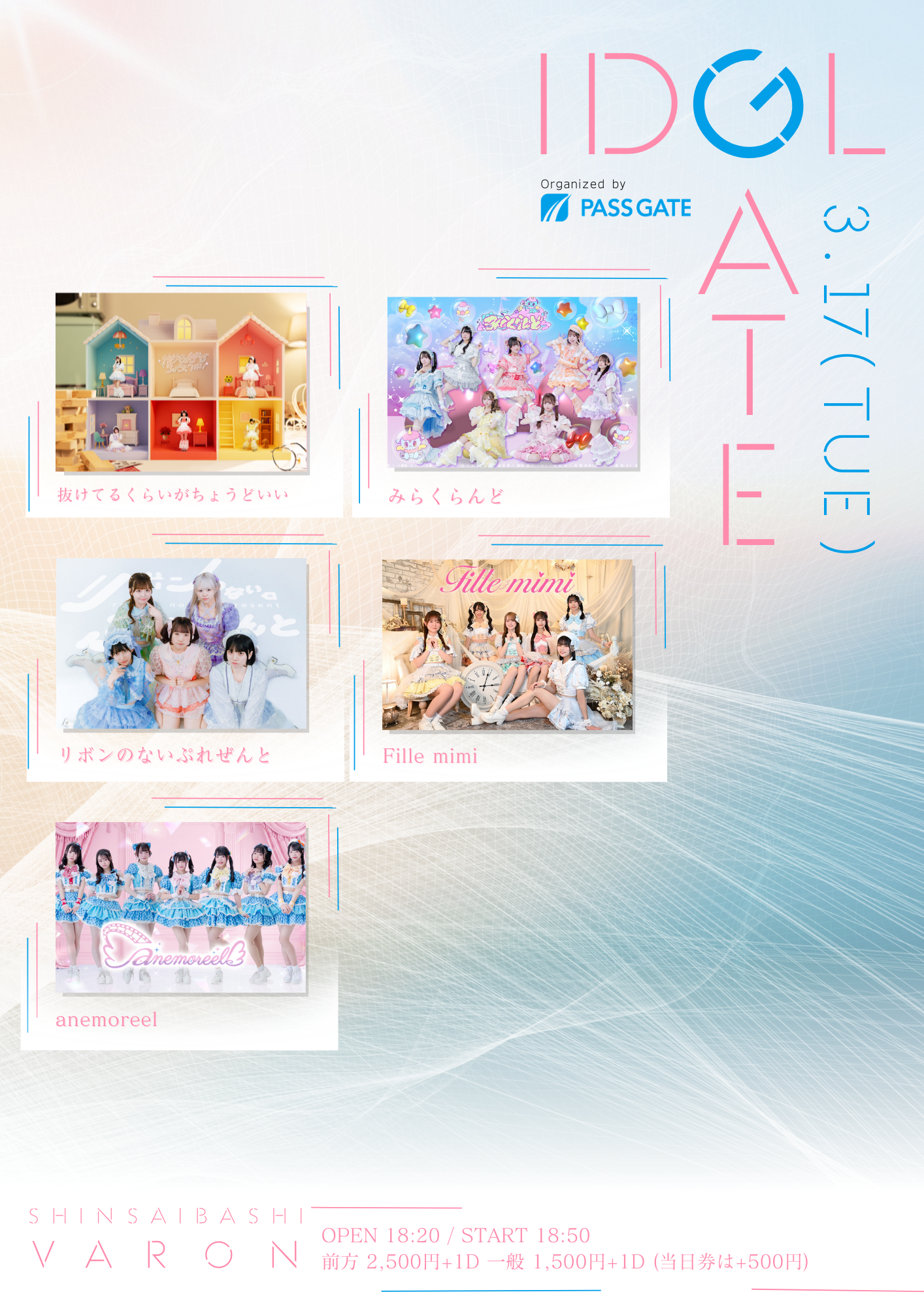 心斎橋 VARON(ヴァロン) スケジュール 2026.3.17(Tue) IDOL GATE in VARON [ACT] 抜けてるくらいがちょうどいい / みらくらんど / リボンのないぷれぜんと / anemoreel / Fille mimi [OPEN/START] 18:20/18:50 [料金] 前方¥2,500/一般 ¥1,500 (+1D) ※当日券 各+¥500 (問)心斎橋VARON 06-6243-1400 / info@osaka-varon.jp 販売URL →https://t-dv.com/idolgate_varon3