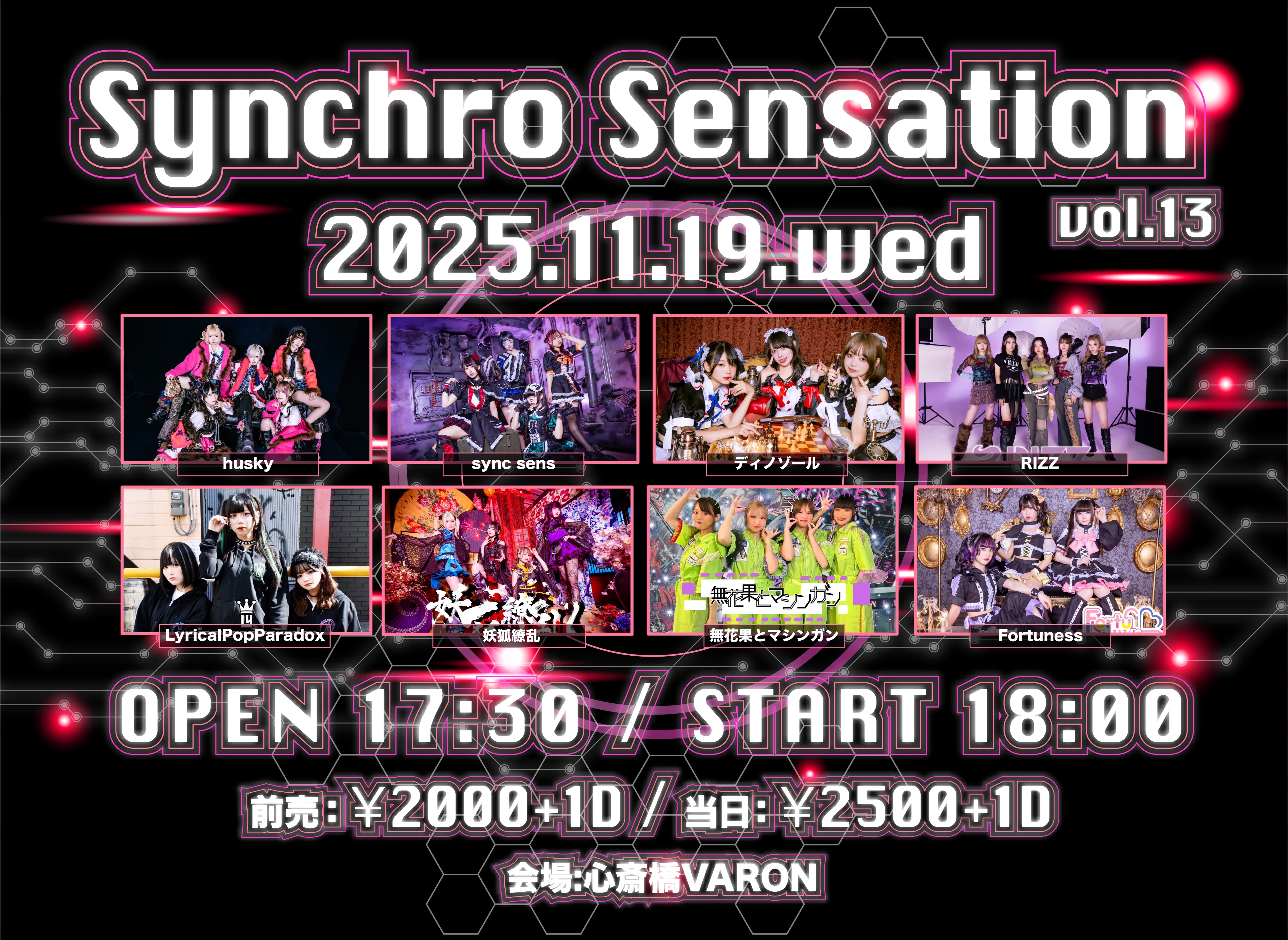 心斎橋 VARON(ヴァロン) スケジュール 2025.11.19(Wed) Synchro Sensation Vol.13 [ACT] husky / sync sens / ディノゾール / RIZZ / LyricalPopParadox / 妖狐繚乱 / 無花果とマシンガン / Fortuness [OPEN/START] 17:30/18:00 [料金] 前売:¥2000 当日:¥2500 (1D別) (問)心斎橋VARON 06-6243-1400 / info@osaka-varon.jp 予約フォーム https://tiget.net/events/437549