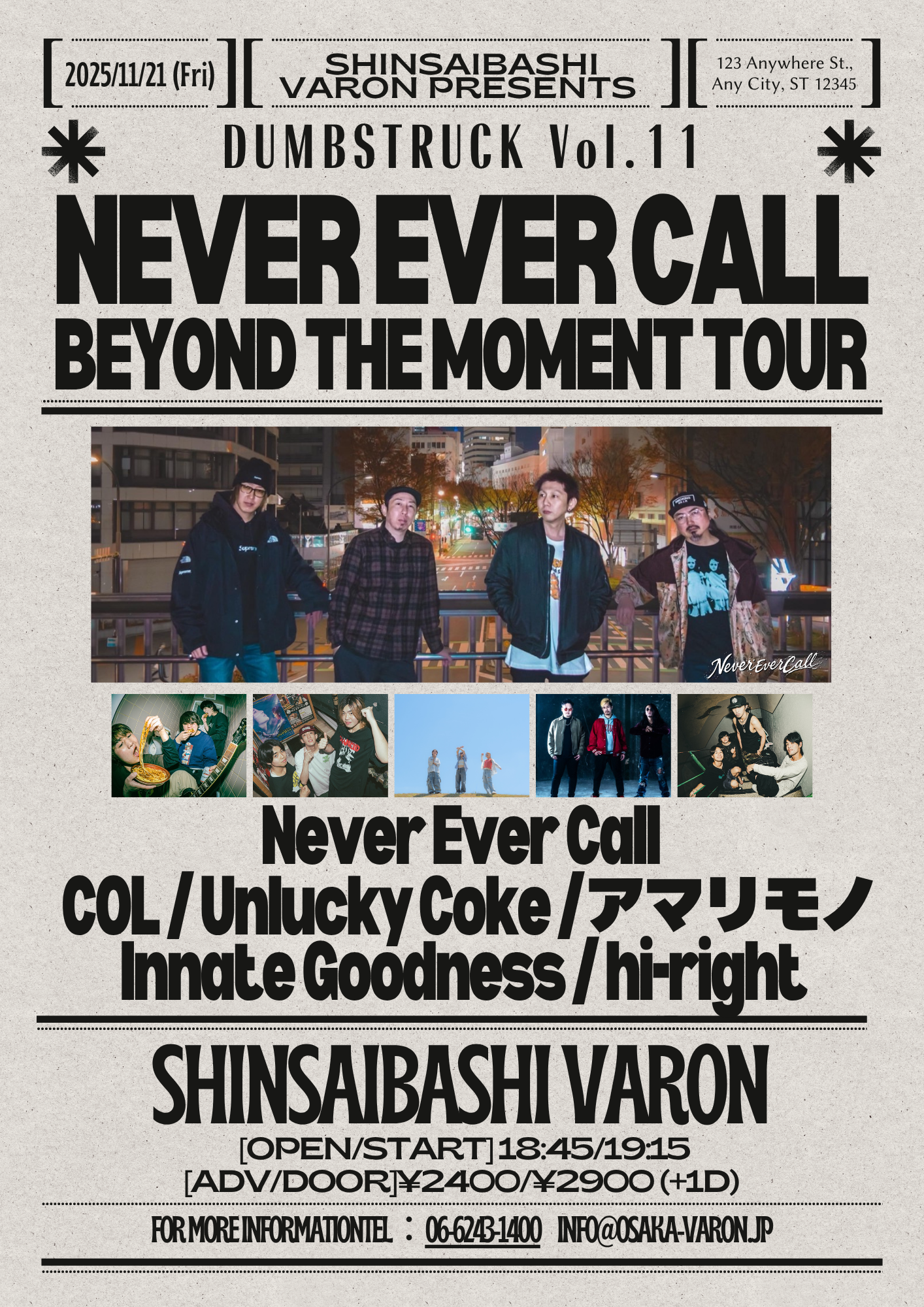 心斎橋 VARON(ヴァロン) スケジュール 2025.11.21(Fri) DUMBSTRUCK Vol.11 Never Ever Call Beyond the MOMENT Tour [ACT] Never Ever Call / COL / Unlucky Coke / アマリモノ / Innate Goodness / hi-right [OPEN/START] 18:45/19:15 [料金] ¥2400/¥2900 (+1D) (問)心斎橋VARON 06-6243-1400 / info@osaka-varon.jp