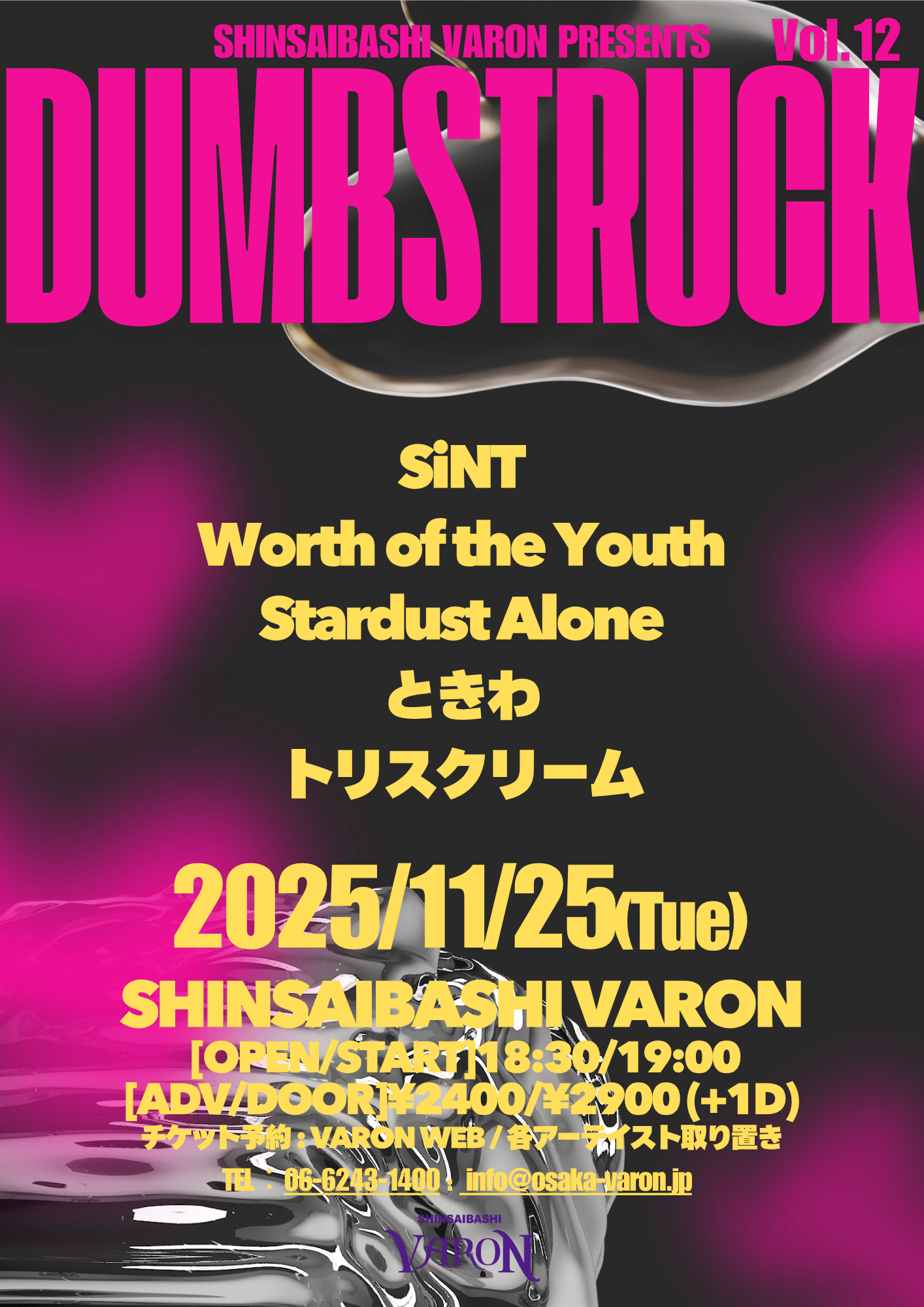 心斎橋 VARON(ヴァロン) スケジュール 2025.11.25(Tue) DUMBSTRUCK Vol.12 [ACT] ときわ / トリスクリーム / SiNT / Stardust Alone / Worth of the Youth [OPEN/START] 18:30 / 19:00 [料金] ¥2400/¥2900 (+1D) (問)心斎橋VARON 06-6243-1400 / info@osaka-varon.jp