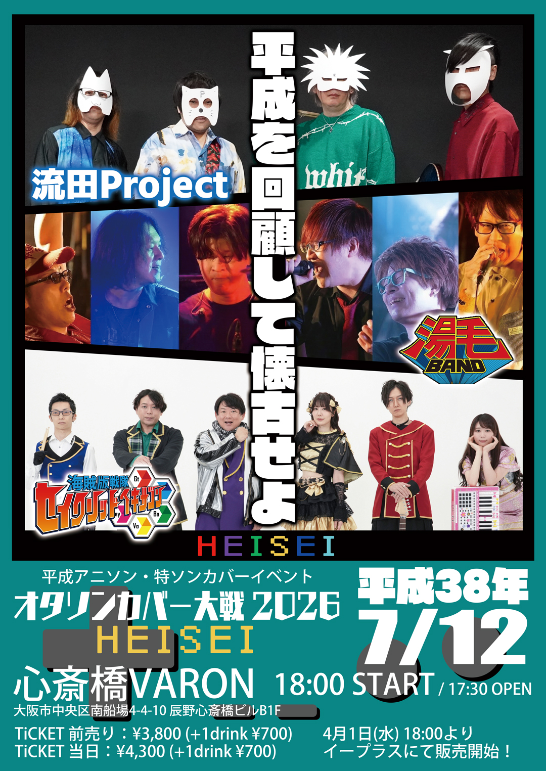 心斎橋 VARON(ヴァロン) スケジュール 2026.7.12(Sun) オタソンカバー大戦 2026 HEISEI [ACT] 海賊版戦隊セイクリッドヘキサゴン / 湯毛BAND / 流田Project [OPEN/START] 17:30/18:00 [料金] 前売 3,800円 / 当日 4,300円(※別途ドリンク代 700円) (問)心斎橋VARON 06-6243-1400 / info@osaka-varon.jp