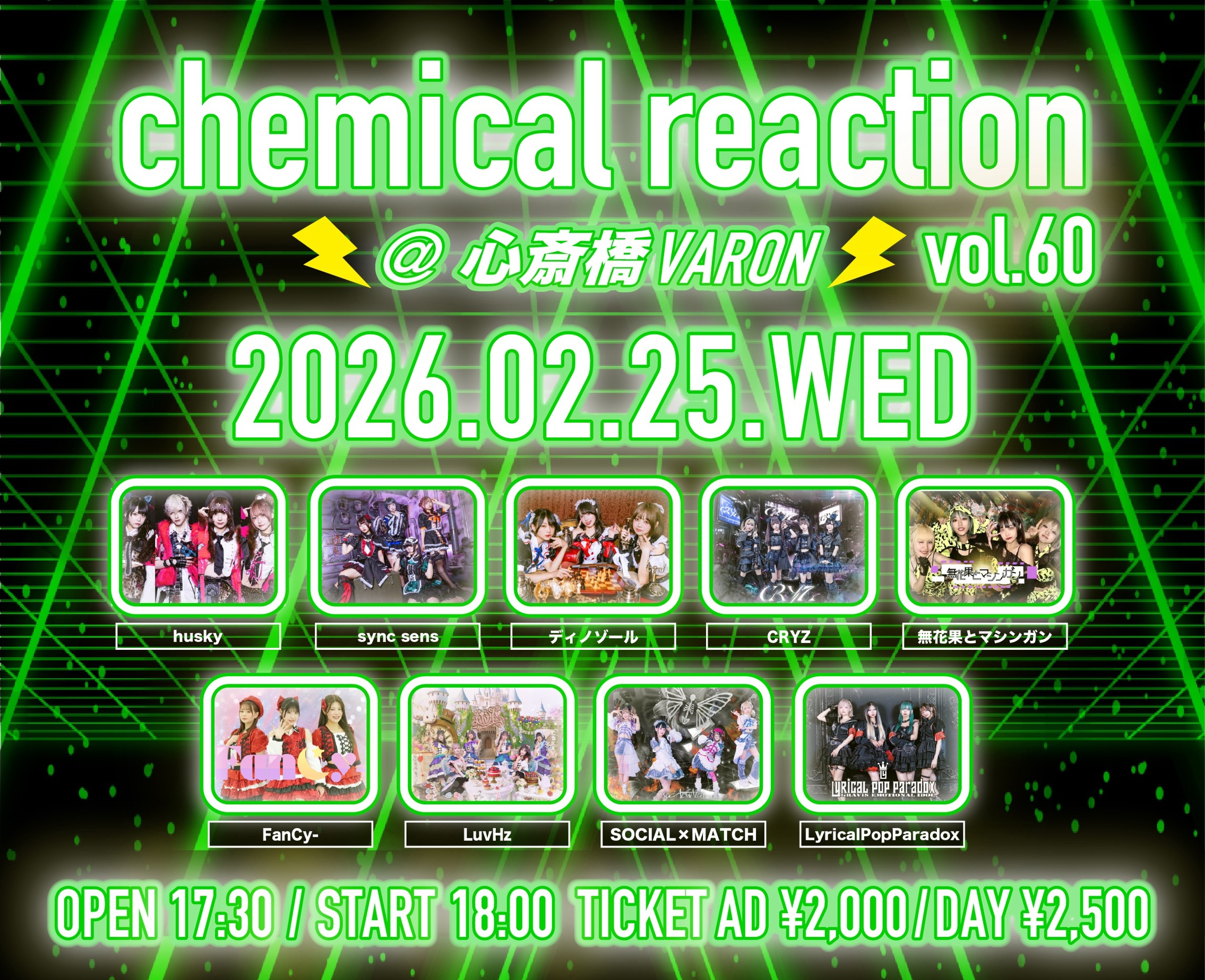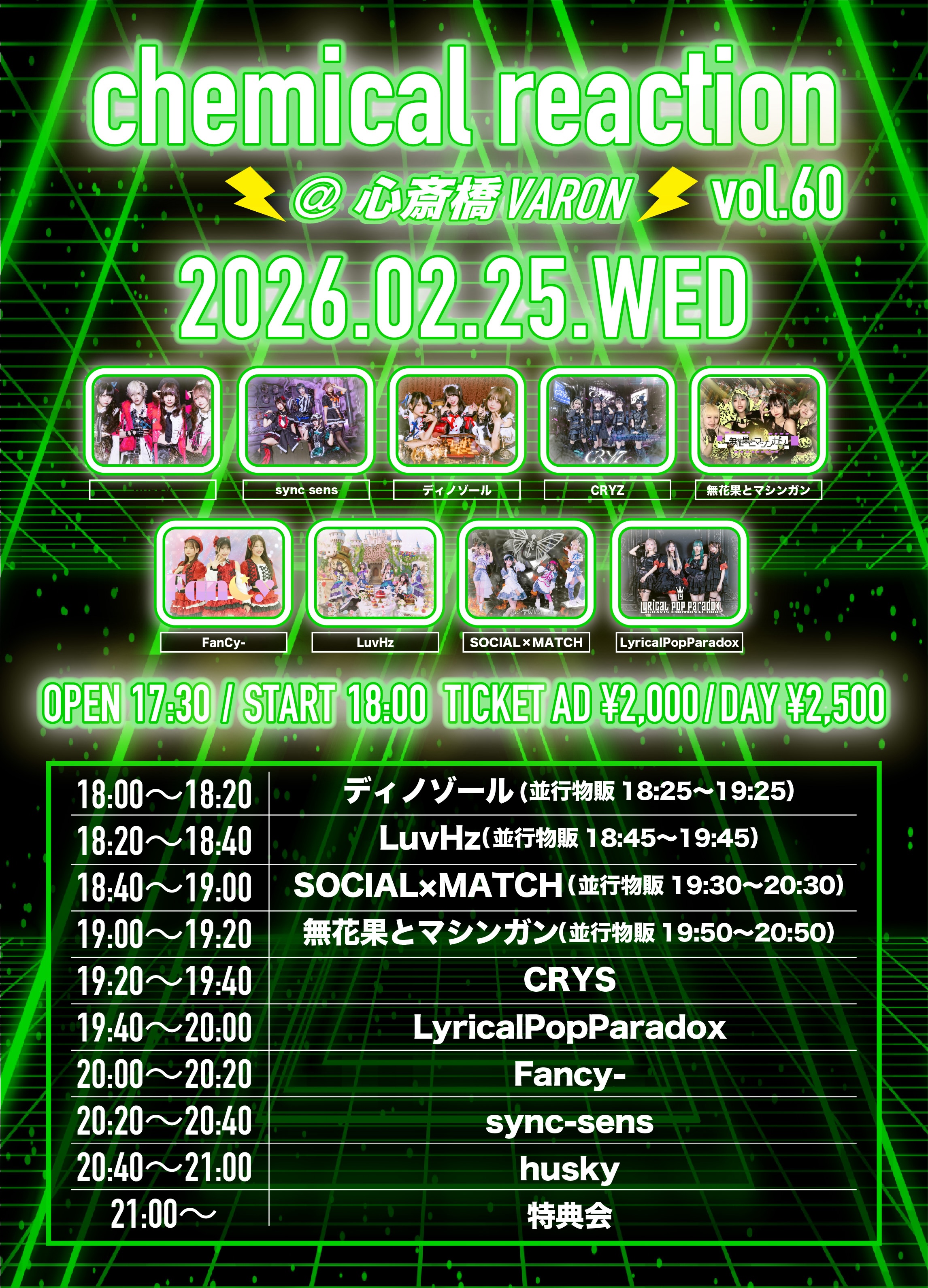 心斎橋 VARON(ヴァロン) スケジュール 2026.2.25(Wed) chemical reaction Vol.60 [ACT] husky / sync sens / ディノゾール / CRYZ / 無花果とマシンガン / FanCy- / LuvHz / SOCIAL×MATCH / LyricalPopParadox [OPEN/START] 17:30/18:00 [料金] 前売:¥2000 当日:¥2500 (1D別) (問)心斎橋VARON 06-6243-1400 / info@osaka-varon.jp