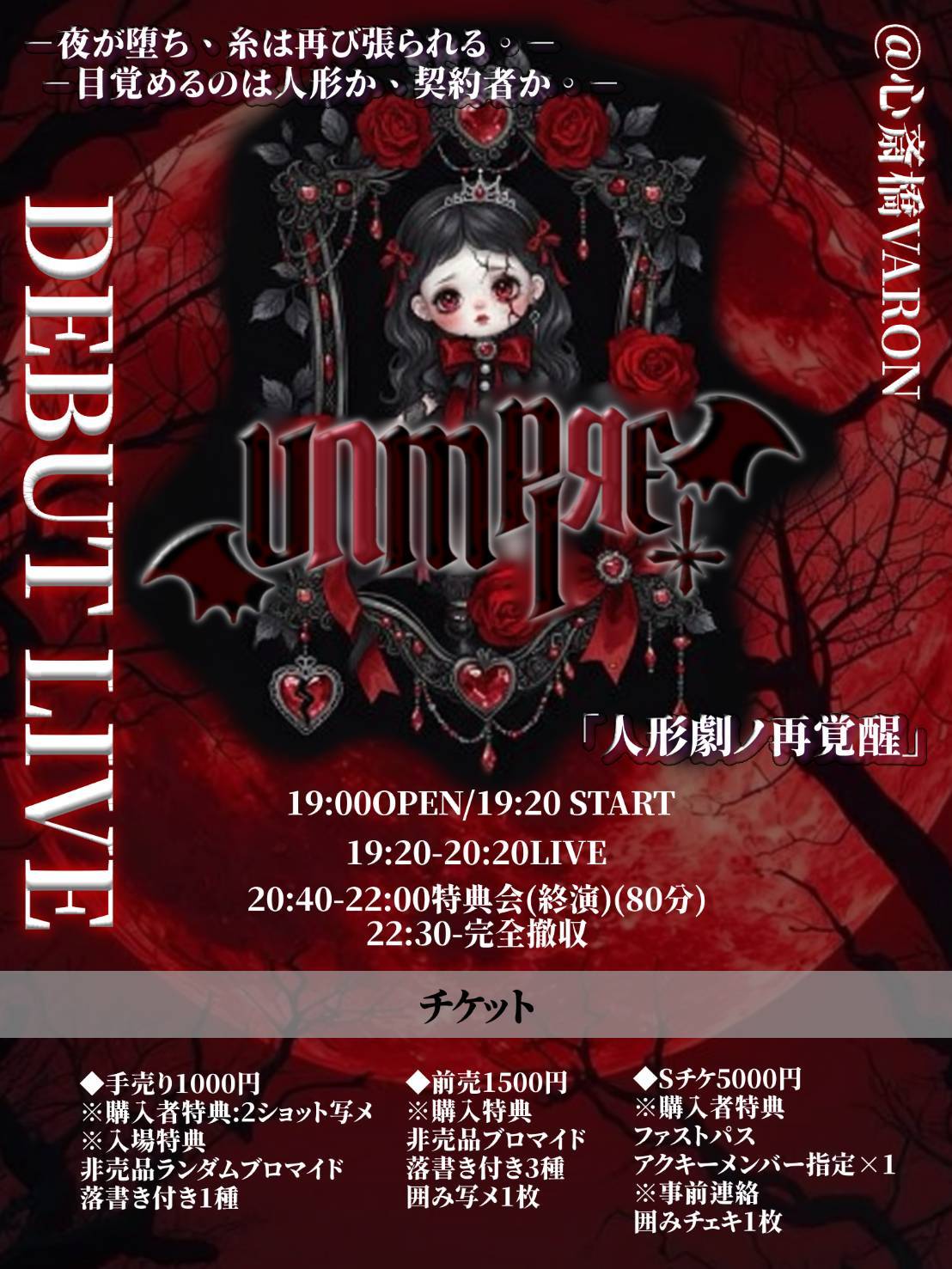 心斎橋 VARON(ヴァロン) スケジュール 2026.2.13(Fri) 「人形劇ノ再覚醒」 [ACT] バンピール [OPEN/START] 19:00/19:20 [料金] 前売り¥1,000- (問)心斎橋VARON 06-6243-1400 / info@osaka-varon.jp 購入者特典:2ショット写メ•落書き 入場特典:非売品ブロマイド(メンバー指定)