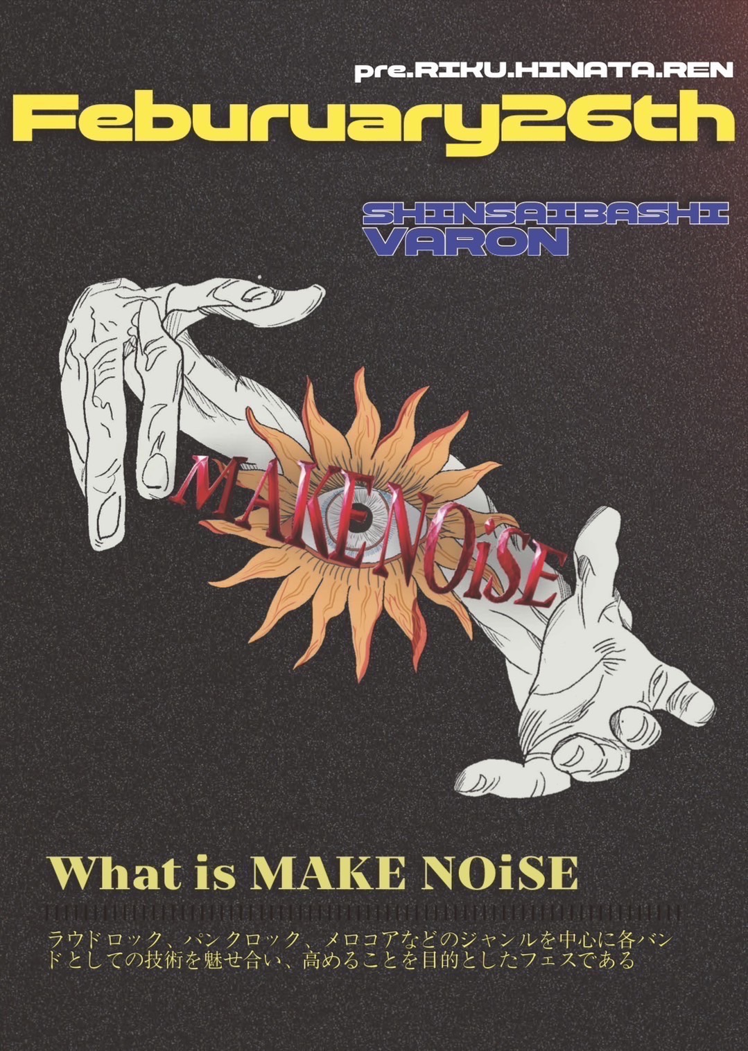 心斎橋 VARON(ヴァロン) スケジュール 2026.2.26(Thu) MAKE NOiSE FEST [ACT] 本気ミテッドサザビーズ / FILARTS-フィルアーツ / タンクトップヒーロー / Power and Harassment / 呑むでガーデン / そこらへんの雨より冷えてます。/ MAKE NOiSE DREAM BAND [OPEN/START] 11:30/11:40 [料金] FREE(+1D¥700) (問)心斎橋VARON 06-6243-1400 / info@osaka-varon.jp