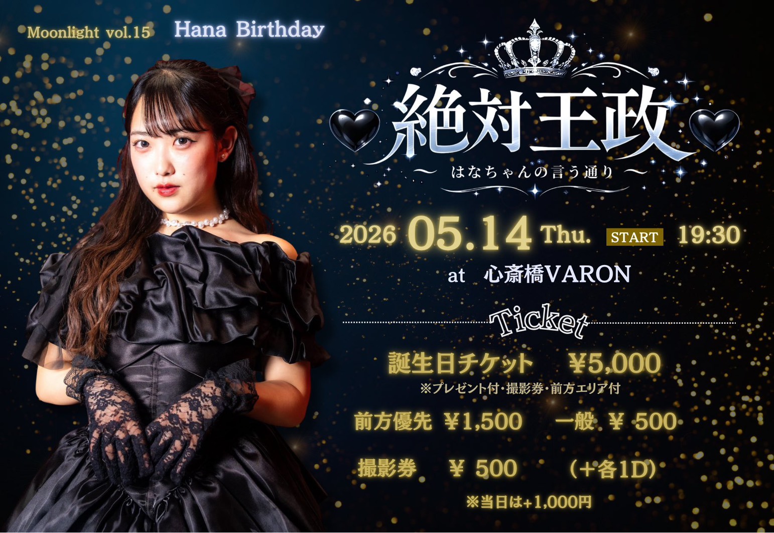 - 生誕日チケット 5000円 / 前方優先 1500円 / 一般 500円 / 撮影 500円 / 当日+1000円 ※各1DRINK代別途必要
