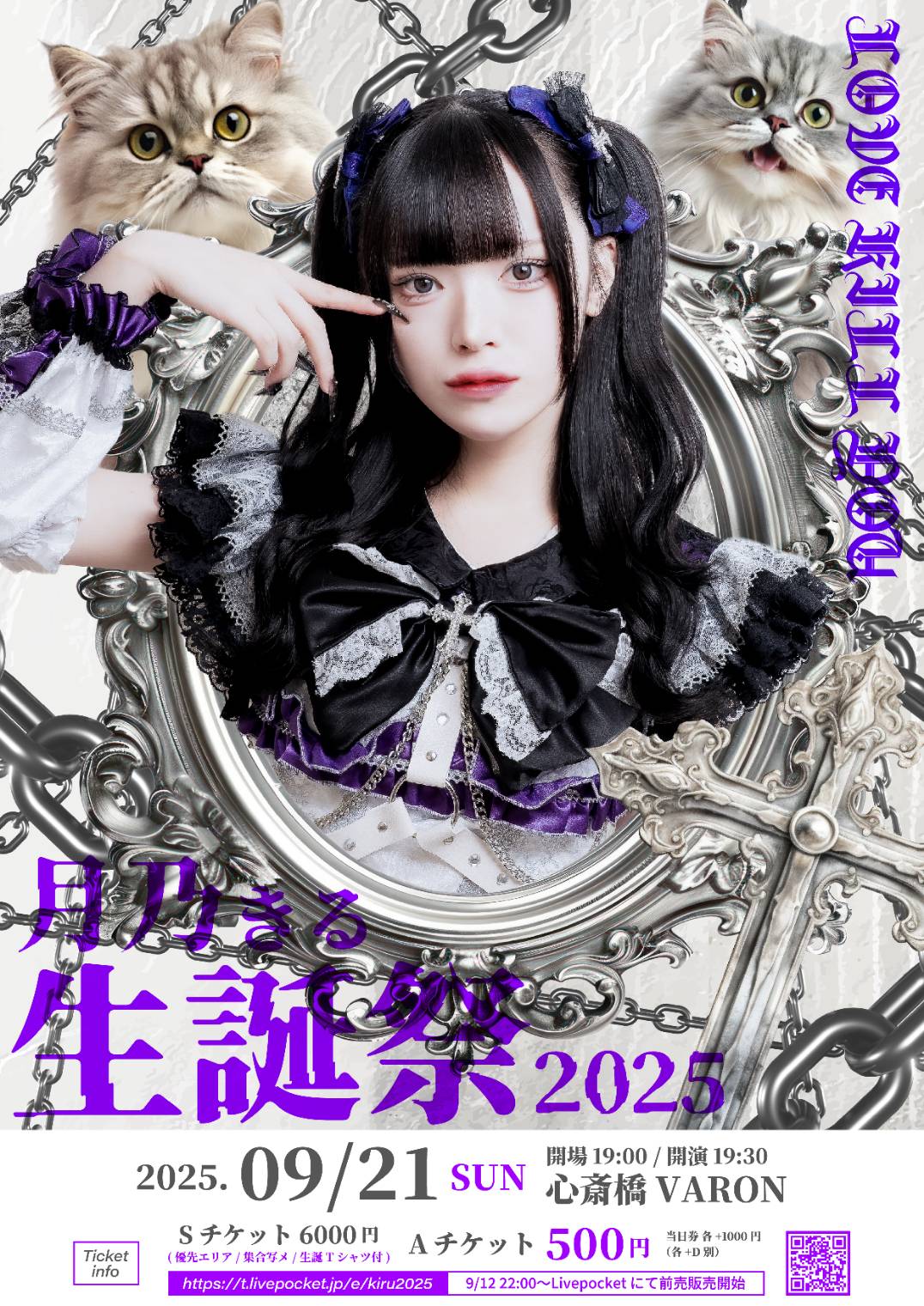 心斎橋 VARON(ヴァロン) スケジュール 2025.9.21(Sun) 月乃きる生誕祭2025 [ACT] ボクセカ [OPEN/START] 19:00/19:30 [料金] ① Sチケット(生誕Tシャツ/優先エリア/集合写メ 付き) 6000円 / ② Aチケット 500円 / ③ 当日券 各+1000円 (各+1D別) (問)心斎橋VARON 06-6243-1400 / info@osaka-varon.jp ■チケットURL https://t.livepocket.jp/e/kiru2025