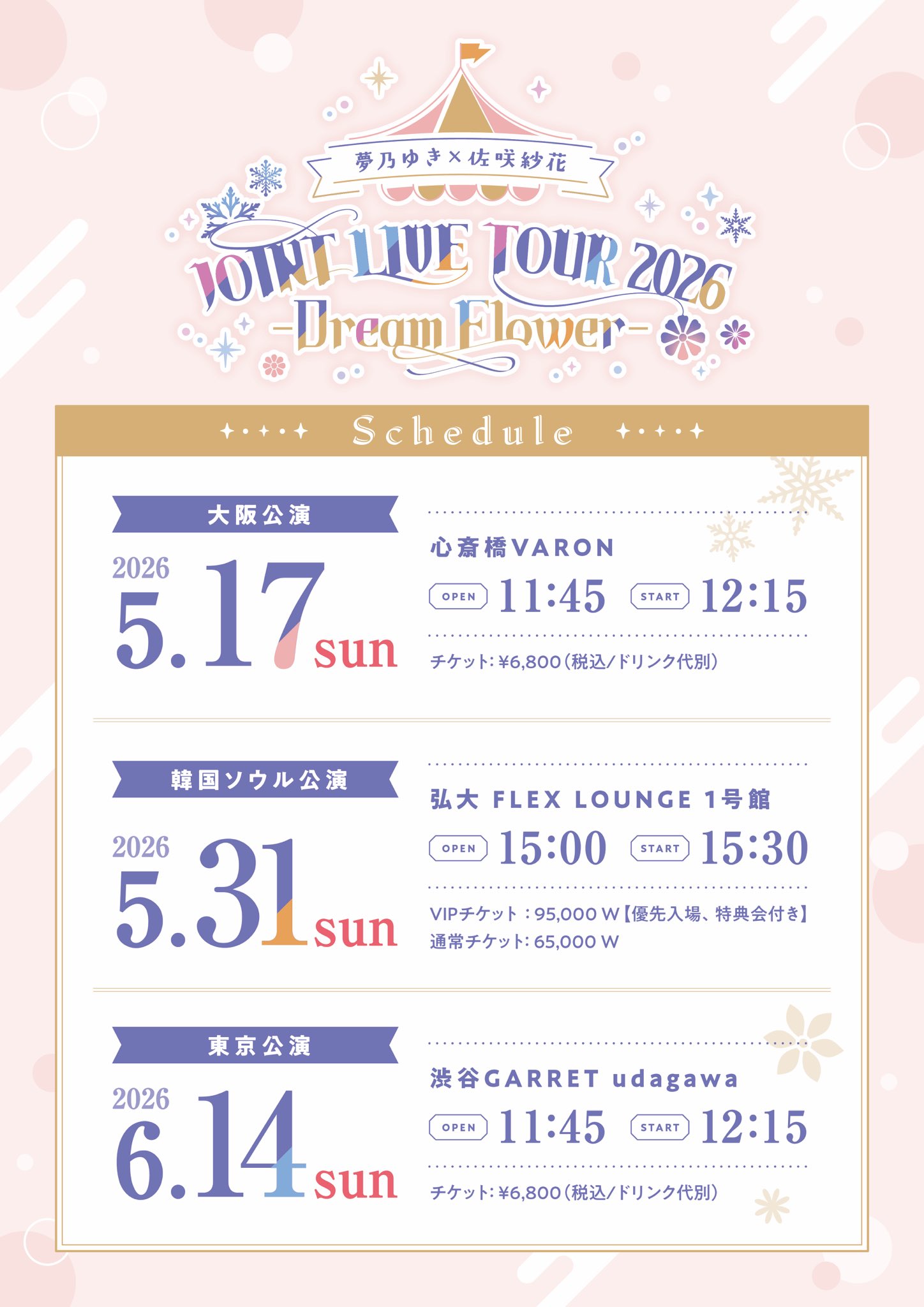 心斎橋 VARON(ヴァロン) スケジュール 2026.5.17(Sun) 夢乃ゆき×佐咲紗花 JOINT LIVE TOUR 2026 - Dream Flower- [ACT] 夢乃ゆき / 佐咲紗花 [OPEN/START] 11:45/12:15 [料金] スタンディング ¥6,800(税込/ドリンク代別) (問)info@sasakisayaka.com / (24時間受付、対応は営業日に限る) ■入場年齢制限:3歳未満入場不可、3歳以上チケット必要 ■枚数制限:お1人様4枚まで購入可能 ※ご入場時、ドリンク代が別途必要となります。 ※チケットに記載してあります、整理番号順でのご入場となります。 ※未就学児童は必ず保護者付添いの元での入場をお願いいたします。 ■主催:Dream Flower制作プロジェクト / 制作:バシットエンタテインメント