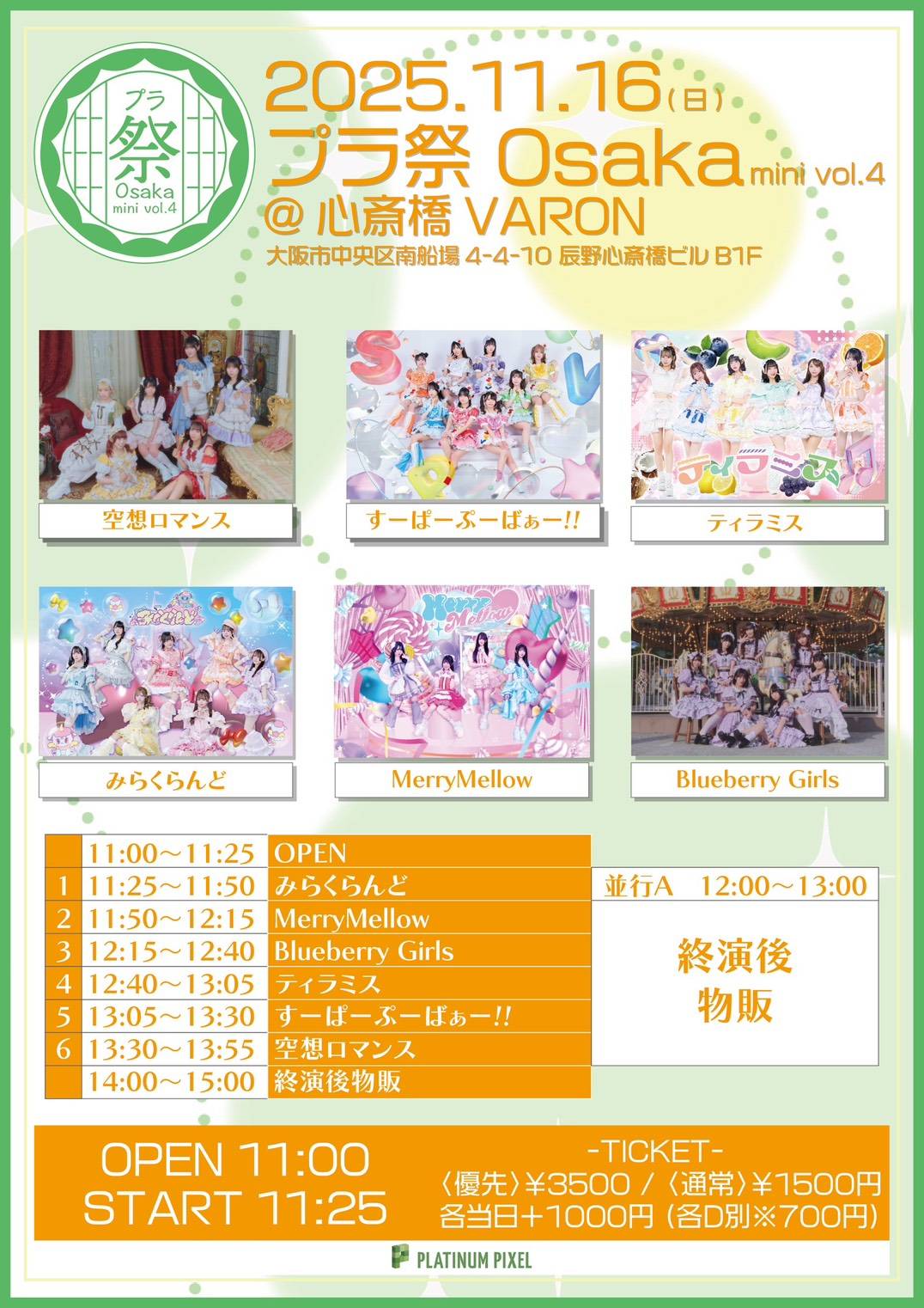 心斎橋 VARON(ヴァロン) スケジュール 2025.11.16(Sun) 『プラ祭Osaka mini vol.4』 [ACT] 空想ロマンス / すーぱーぷーばぁー!! / ティラミス / Blueberry Girls / みらくらんど / MerryMellow [OPEN/START] 11:00/11:25 [料金] 優先エリア3500円/通常1500円/当日+1000円(D別※700円) (問)心斎橋VARON 06-6243-1400 / info@osaka-varon.jp 【チケットURL】 https://t-dv.com/plasai_vol4