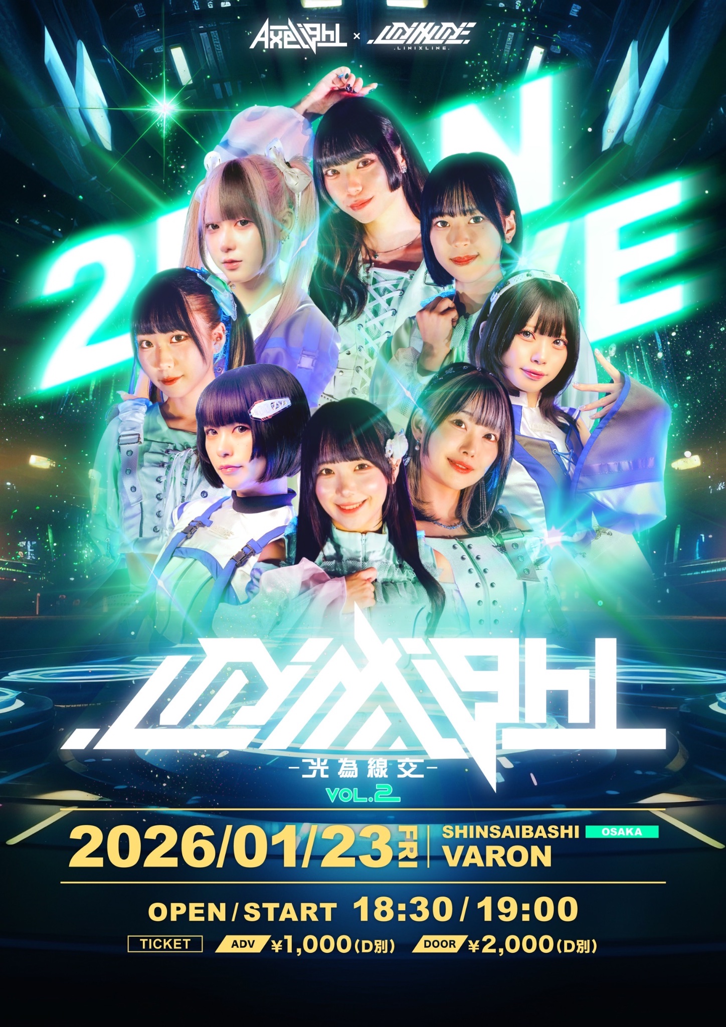 心斎橋 VARON(ヴァロン) スケジュール 2026.1.23(Fri) .LiNIXlight - 光為線交 - VOL.2 [ACT] Axelight / .LiNIXLiNE. [OPEN/START] 18:30/19:00 [料金] ADV/DOOR ¥1,000/¥2,000(1D別) (問)心斎橋VARON 06-6243-1400 / info@osaka-varon.jp チケット →https://livepocket.jp/e/linixlightv2