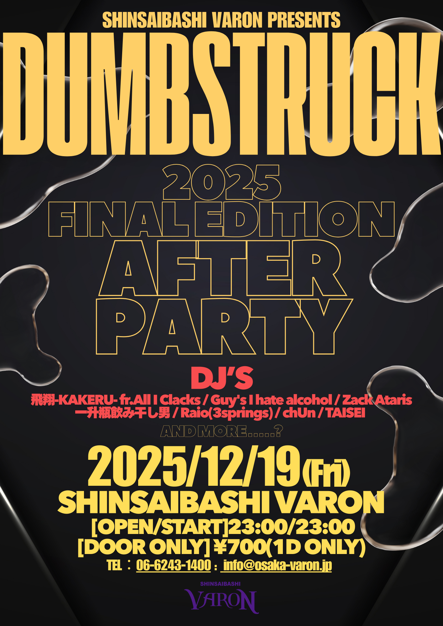 心斎橋 VARON(ヴァロン) スケジュール 2025.12.19(Fri) DUMBSTRUCK 2025 FINAL EDITION AFTER PARTY [ACT] 飛翔-KAKERU- fr.All I Clacks / Guy's I hate alcohol / Zack Ataris 一升瓶飲み干し男 / Raio(3springs) / chUn / TAISEI [OPEN/START] 23:00/23:00 [料金] 1D ONLY (問)心斎橋VARON 06-6243-1400 / info@osaka-varon.jp