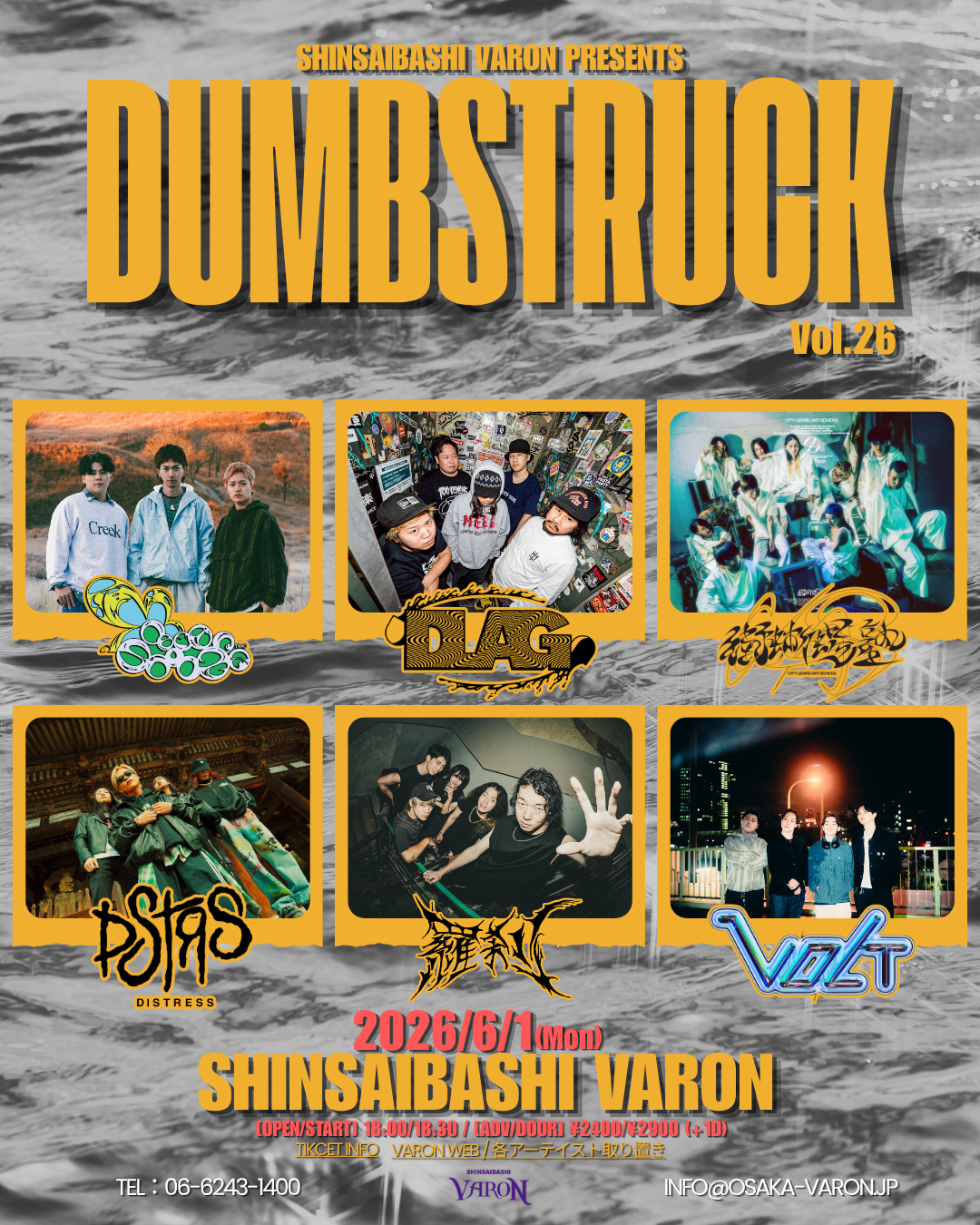 心斎橋 VARON(ヴァロン) スケジュール 2026.6.01(Mon) DUMBSTRUCK Vol.26 [ACT] DISTRESS / DLAG / neversnooze / VOLT / 街蜥蜴塾 / 羅刹 [OPEN/START] 18:00 / 18:30 [料金] ¥2400/¥2900 (+1D) (問)心斎橋VARON 06-6243-1400 / info@osaka-varon.jp
