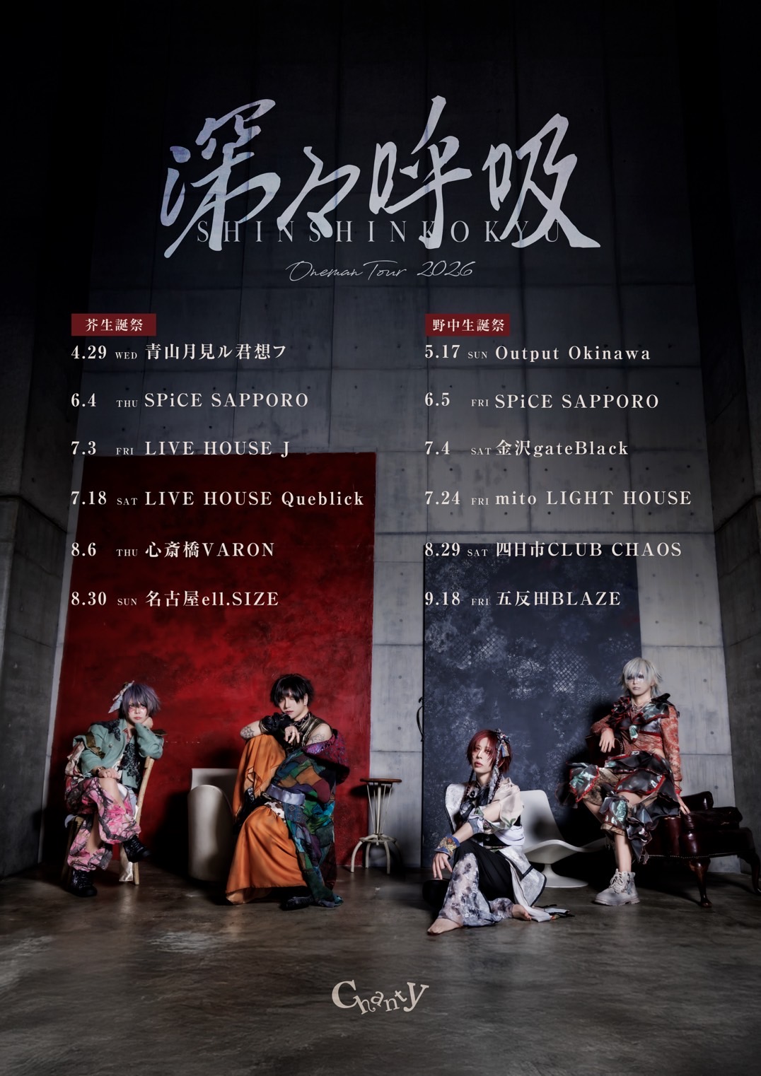 心斎橋 VARON(ヴァロン) スケジュール 2026.8.06(Thu) ONEMANTOUR 2026 深々呼吸 [ACT] Chanty [OPEN/START] 17:30/18:00 [料金] 前売り ¥4,500 / 当日 ¥5,000 (1D別途必要) (問)info@chanty.jp 企画:まんぷくレコーズ