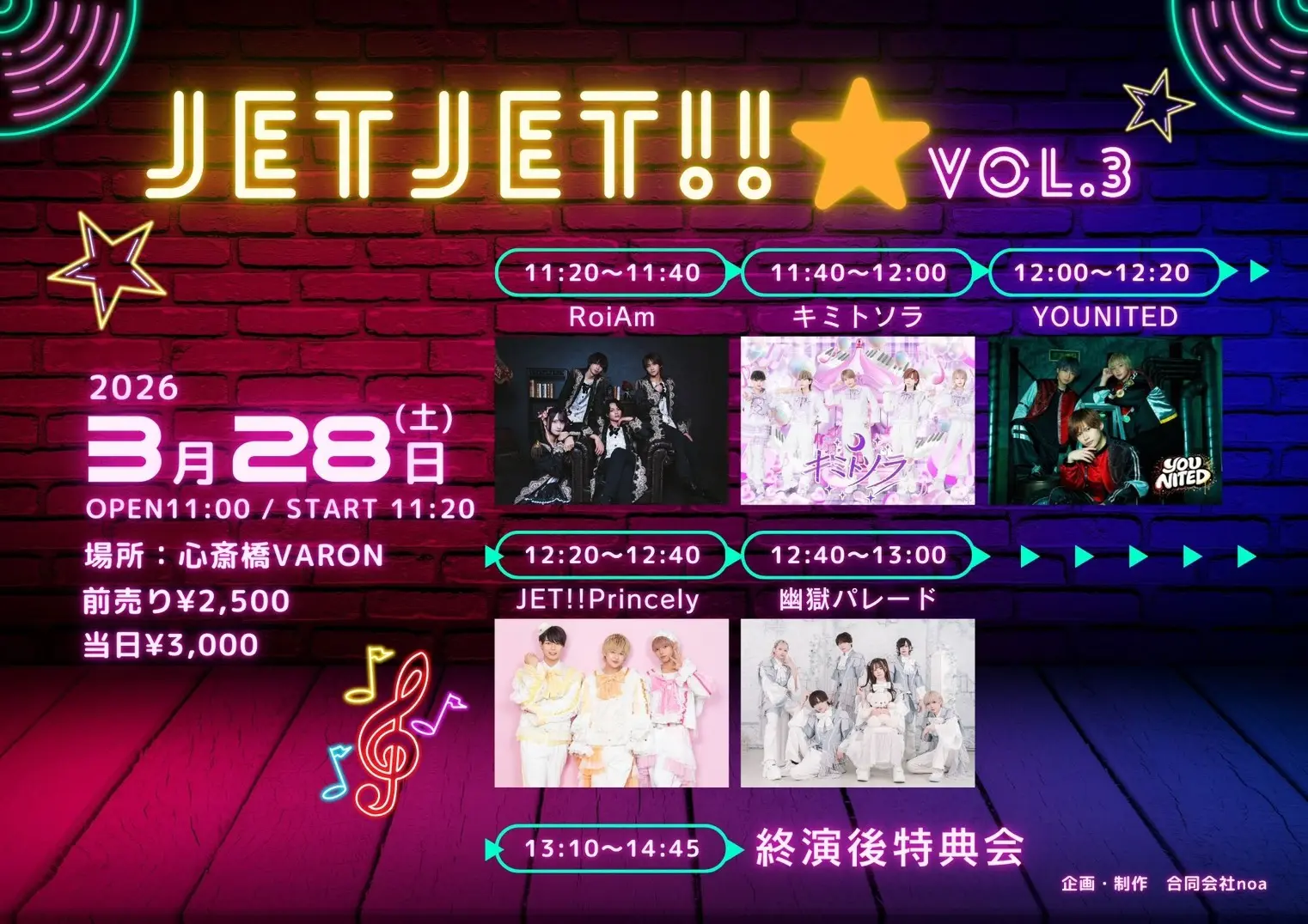 心斎橋 VARON(ヴァロン) スケジュール 2026.3.28(Sat) 『JET JET‼☆』vol.3 [ACT] JET!!Princely / RoiAm / キミトソラ / YOUNITED / 幽獄パレード [OPEN/START] 11:00/11:20 [料金] 前売り¥2,500/ 当日¥3,000 (1D別途必要) (問)心斎橋VARON 06-6243-1400 / info@osaka-varon.jp チケット →https://livepocket.jp/e/jetjet20260328