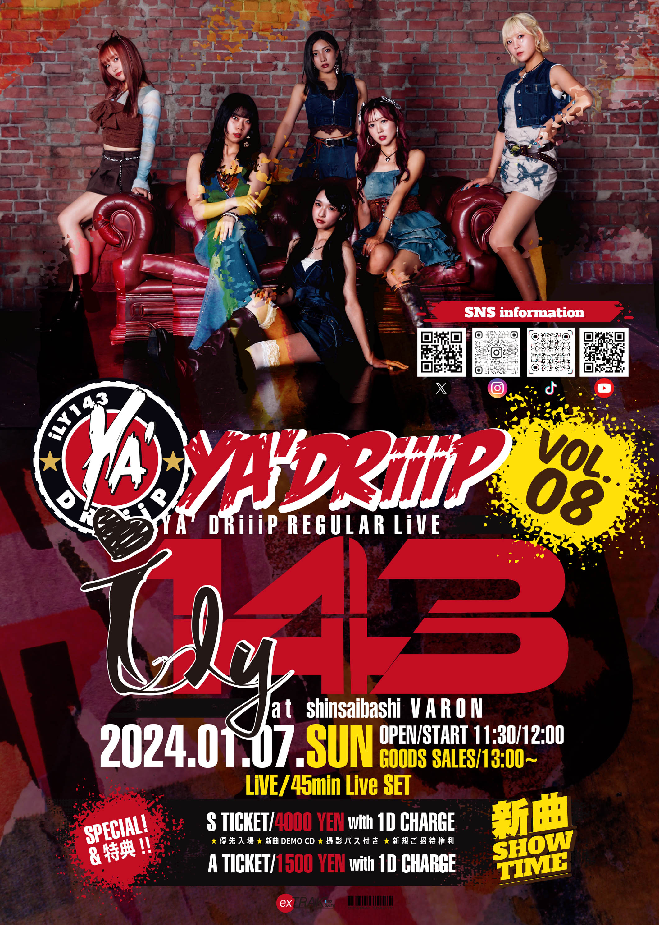 心斎橋 VARON(ヴァロン) スケジュール 2024.1.07(Sun) -YA'DRiiiP REGULAR LiVE-“iLY//143 vol.8-NEW YAER SP-” [ACT] YA'DRiiiP [OPEN/START] 11:30/12:00 (予定) [料金] ・Sチケット 4000YEN/別途ドリンク代金※特典付き ・通常チケット 1500YEN/別途ドリンク代金 (問)心斎橋VARON 06-6243-1400 / info@osaka-varon.jp 【Sチケット/特典】 ・新曲 demo CD(#17) ・優先入場 ・撮影パス※最前撮影NG ・新規ご招待権利 【Sチケット新規ご招待特典】 ・1〜4名→トーク2分を人数分プレゼント ・5〜8名→ガチャ2回人数分プレゼント ・9〜10名→STAFFにお尋ねください 【ご招待されたお客様特典】 ・D代金にて入場可能 ・ガチャコイン2回プレゼント!! ※ガチャコインはSTAFFにお尋ねください・権利は当日のみ使用可能・譲渡可能 【入場順】 S→A
