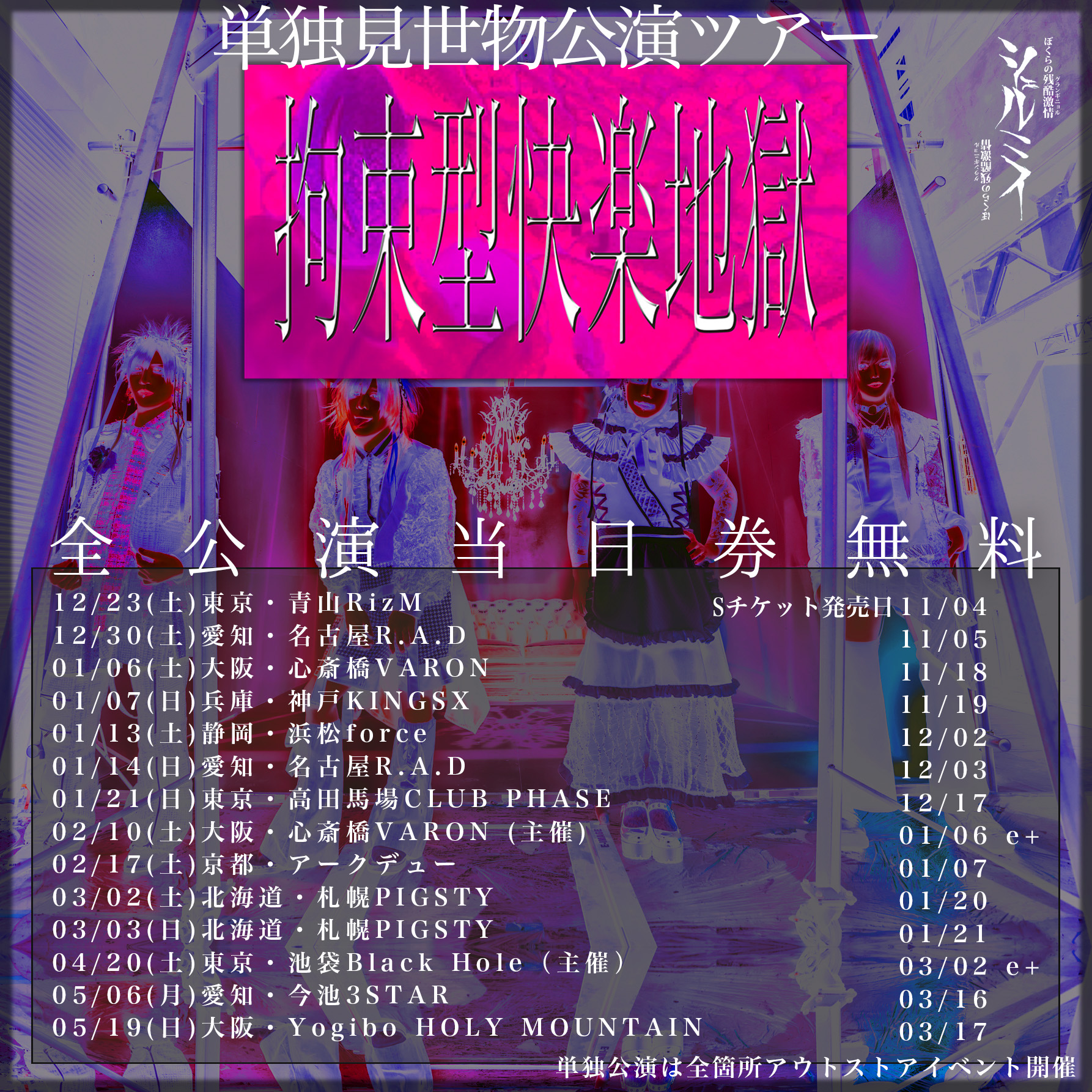 心斎橋 VARON(ヴァロン) スケジュール 2024.1.06(Sat) シェルミィ単独見世物公演ツアー 「拘束型快楽地獄」 [ACT] シェルミィ [OPEN/START] 16:30/17:00 [料金] [S]撮影会参加券付きSチケット 5000円(D代別) ※当日無料枠有り (問)心斎橋VARON 06-6243-1400 / info@osaka-varon.jp 【チケット】 [S]撮影会参加券付きSチケット 5000円(D代別) →2023年11月18日より公式ウェブストア負け犬倶楽部にて限定販売 ★チケット特典: 終演後行われる2shot撮影会参加