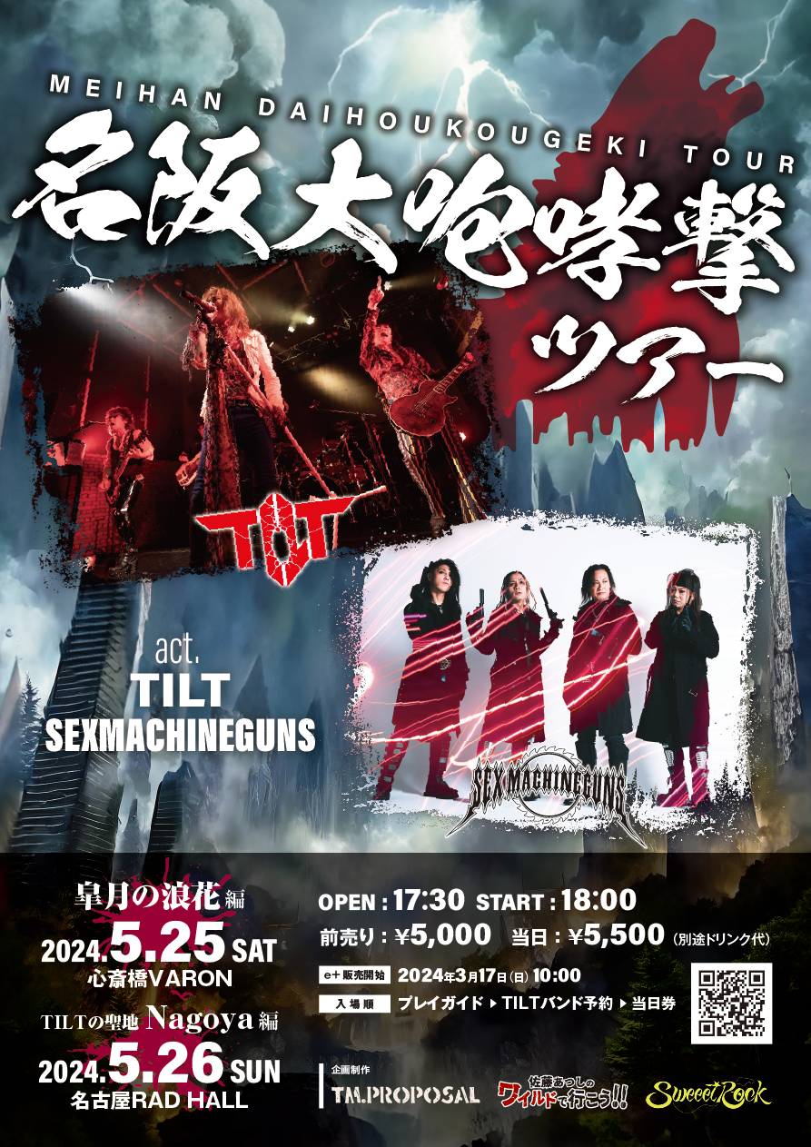 心斎橋 VARON(ヴァロン) スケジュール 2024.5.25(Sat) 『名阪大咆哮撃ツアー』TILT vs. SEX MACHINEGUNS 〜皐月の浪速編〜 [ACT] TILT / SEX MACHINEGUNS [OPEN/START] 17:30/18:00 [料金] 前売り ¥5,000 / 当日 ¥5,500(1D別) ※就学児以上チケット必要・就学児未満ドリンク代必要 企画・制作 / TM. PROPOSAL / Sweeet Rock (問)心斎橋VARON 06-6243-1400 / info@osaka-varon.jp