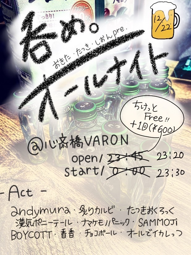 心斎橋 VARON(ヴァロン) スケジュール 2023.12.22(Fri) おきた・かつき・しおん pre. 呑めオールナイト [ACT] andymura / チョコボール / ナマケモノパニック / 漢気ポニーテール / SAMMOJi / 炙りカルビ / 香香 / オールでイカれっつ / BOYCOTT / たつきおくろっく [OPEN/START] 23:20/23:30 [料金] FREE (+1D¥600) (問)心斎橋VARON 06-6243-1400 / info@osaka-varon.jp