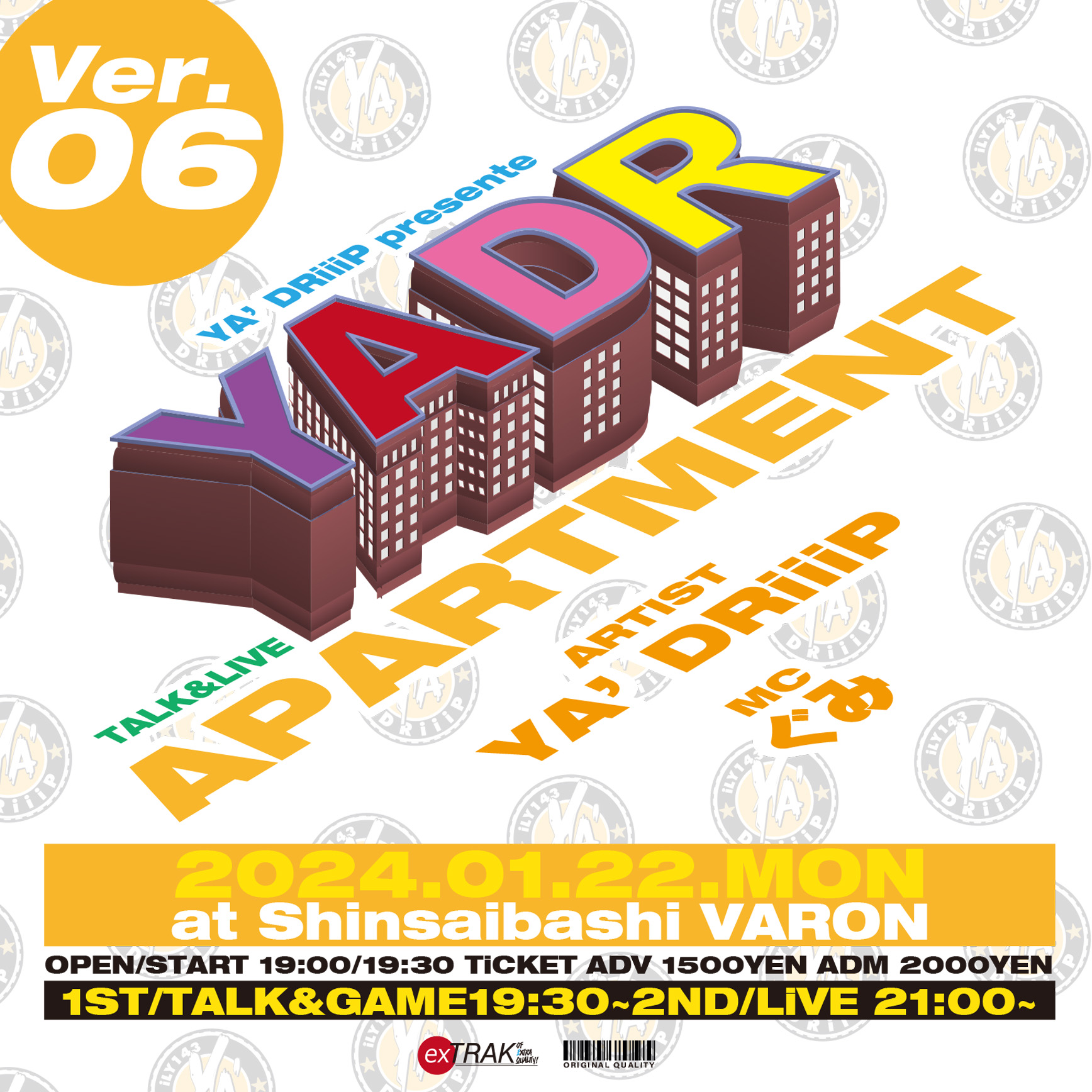 心斎橋 VARON(ヴァロン) スケジュール 2024.1.22(Mon) -YA'DRiiiP presents--TALK&LiVE-“YADR APARTMENT Ver.6” [ACT] [TALK&LiVE] YA'DRiiiP / [MC] ぐみ [OPEN/START] 19:00/19:30 [料金] 1500YEN/別途ドリンク代金 (問)心斎橋VARON 06-6243-1400 / info@osaka-varon.jp 注:))本公演は座席有りとなります・入場者数によりお席がご用意できない場合もございますので予めご了承くださいませ