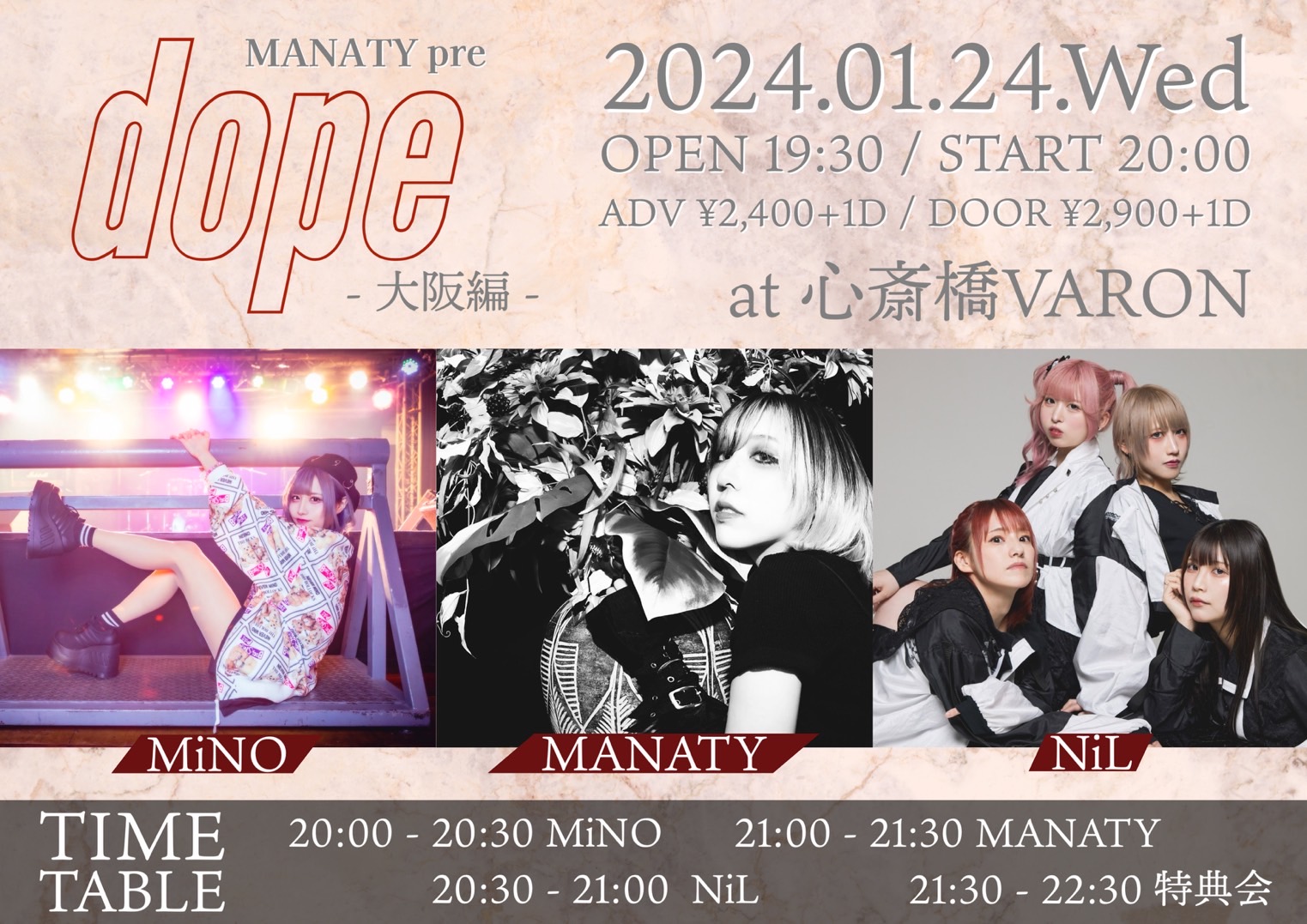 心斎橋 VARON(ヴァロン) スケジュール 2024.1.24(Wed) dope-大阪編- [ACT] MANATY / MiNO / NiL [OPEN/START] 19:30/20:00 [料金] ADV/DOOR ¥2,400/¥2,900(+1D) (問)心斎橋VARON 06-6243-1400 / info@osaka-varon.jp チケットはこちら→ https://t.livepocket.jp/e/54fkv