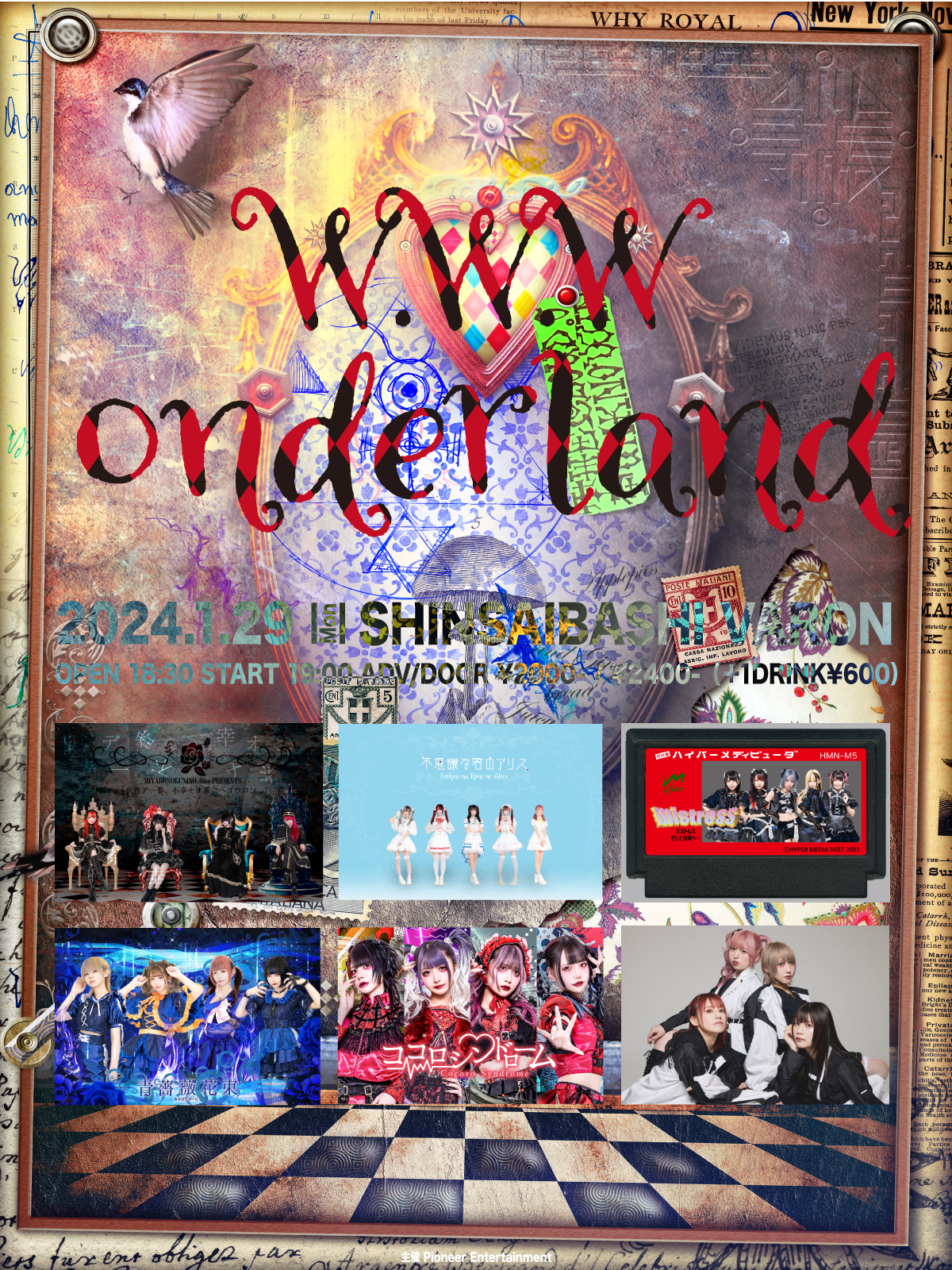 心斎橋 VARON(ヴァロン) スケジュール 2024.1.29(Mon) W.W.Wonderland [ACT] 都の国のアリス / 不思議な君のアリス / mistress / NiL / ココロシンドローム / 青薔薇花束 [OPEN/START] 18:30/19:00 [料金] 事前予約2000円(1D) / 当日販売2400円(1D) (問)心斎橋VARON 06-6243-1400 / info@osaka-varon.jp チケットURL:https://tiget.net/events/294534