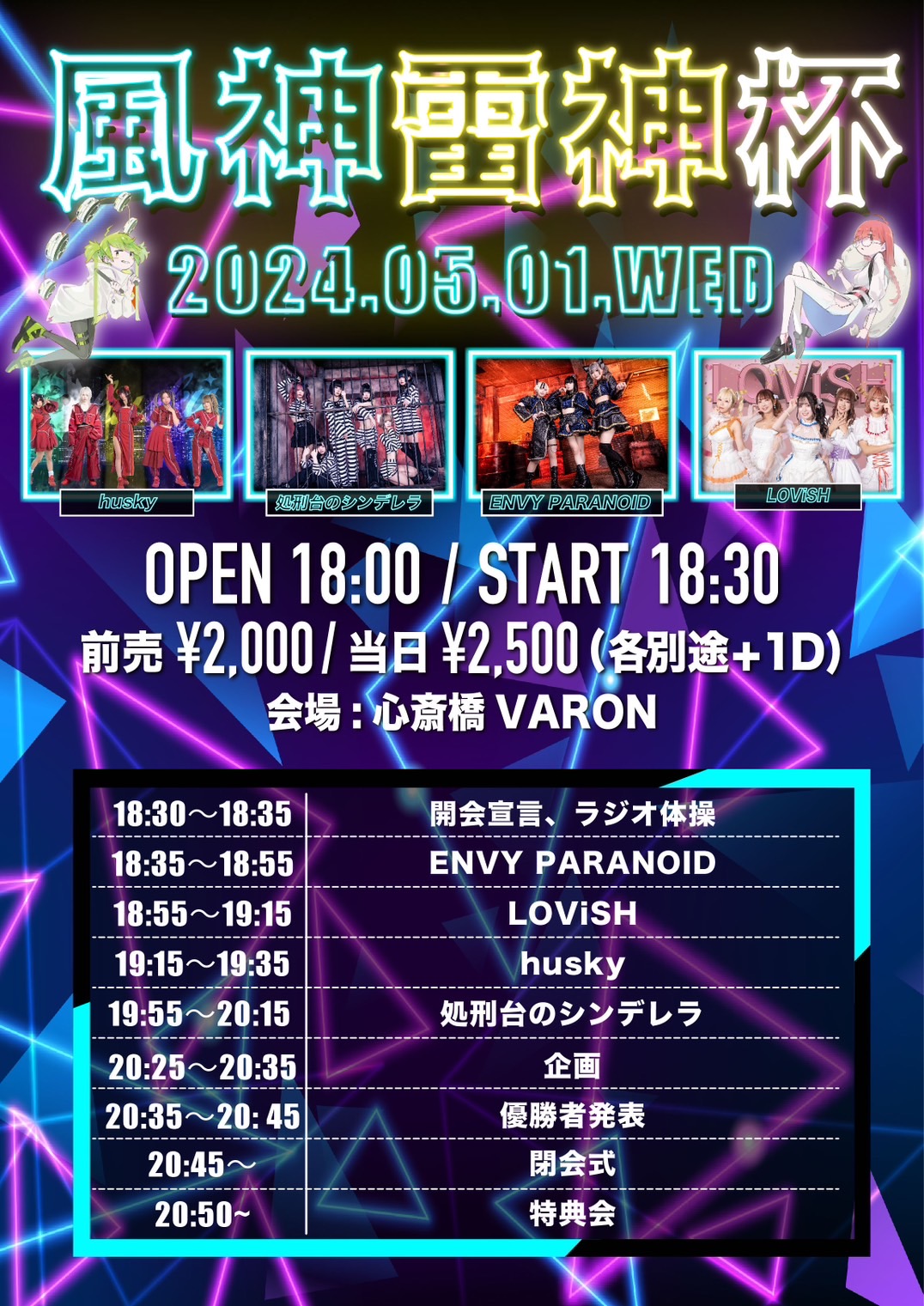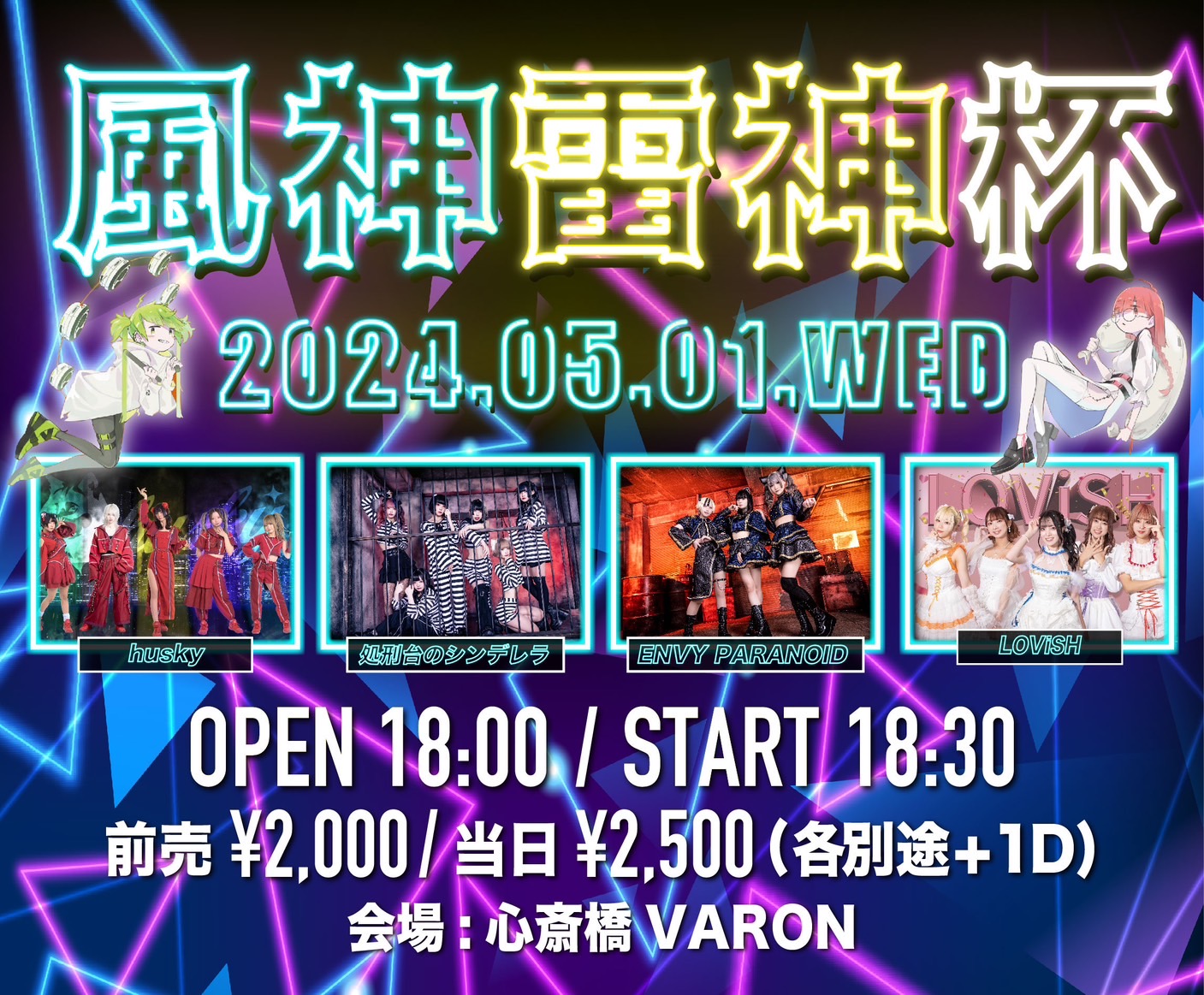心斎橋 VARON(ヴァロン) スケジュール 2024.5.01(Wed) 風神雷神杯 [ACT] husky / 処刑台のシンデレラ / ENVY PARANOID / LOViSH [OPEN/START] 18:00/18:30 [料金] 前売 2000円 / 当日 2500円 (別途1ドリンク600円) (問)心斎橋VARON 06-6243-1400 / info@osaka-varon.jp 予約フォーム https://tiget.net/events/313510