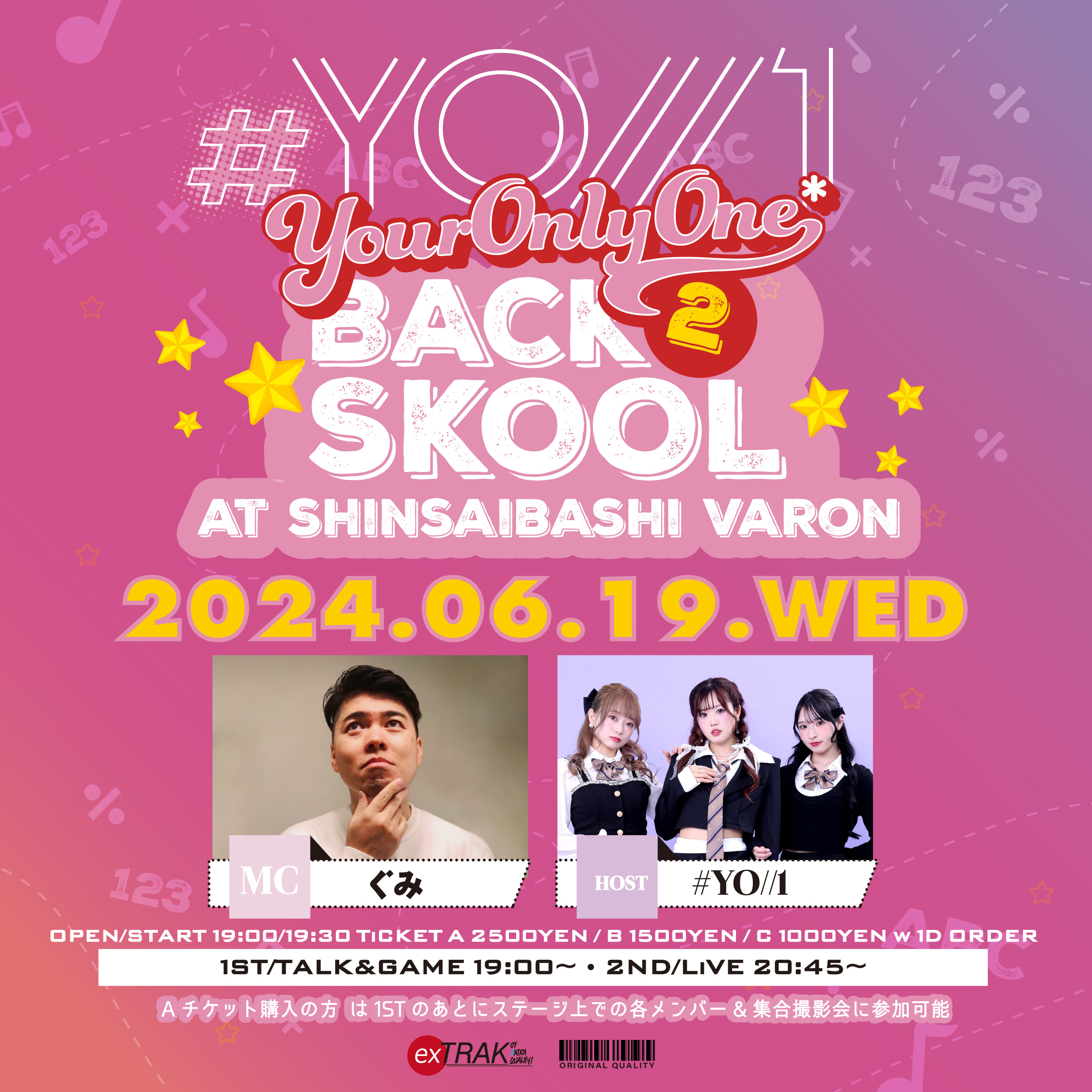 心斎橋 VARON(ヴァロン) スケジュール 2024.6.19(Wed) -#YO//1 TALK&LiVE-“BACK 2 SKOOL vol.3” [ACT] [act] #YO//1 / [MC] グミ [OPEN/START] 18:30/19:00 [料金] [A] 2500YEN/撮影会&1部撮影可能 / [B] 1500YEN/1部撮影可能 / [C] 1000YEN ※A,B,Cともに別途ドリンク代金 (問)心斎橋VARON 06-6243-1400 / info@osaka-varon.jp チケット →https://t.livepocket.jp/e/cszg1