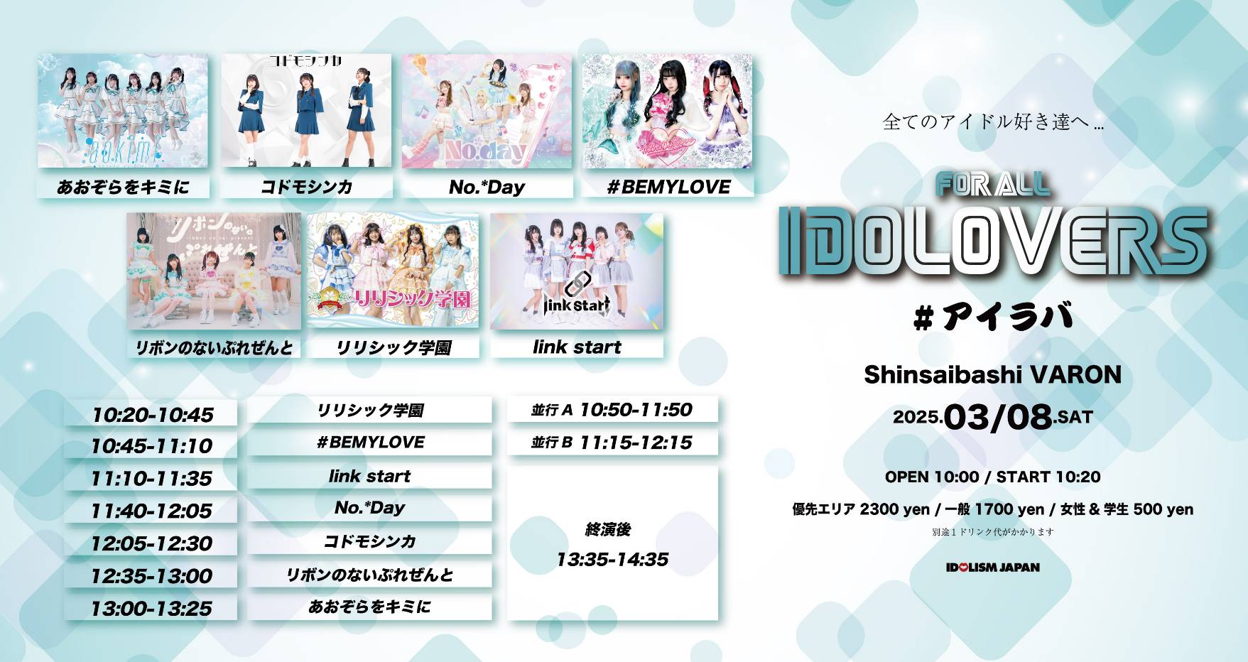 - 優先2300円/一般1700円/女性&学生500円(別途1ドリンク)