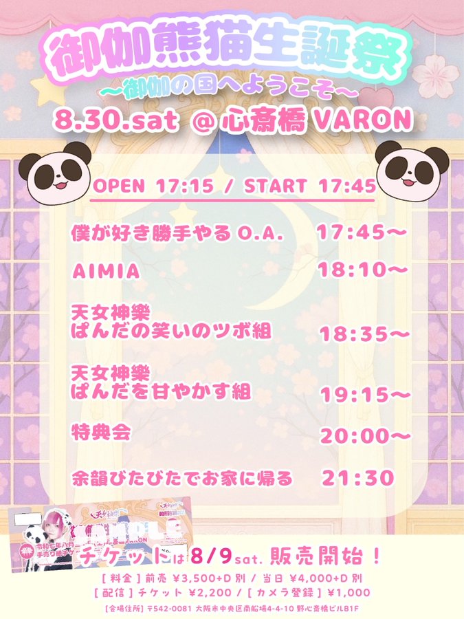 心斎橋 VARON(ヴァロン) スケジュール 2025.8.30(Sat) 天女神樂『御伽熊猫生誕祭2025』 [ACT] 天女神樂 / AIMIA [OPEN/START] 17:15/17:45 [料金] 前売 ¥3,500+(1D代) / 当日 ¥4,000+(1D代) / 配信チケット¥2,200 / カメラ登録料+¥1,000 (問)心斎橋VARON 06-6243-1400 / info@osaka-varon.jp 出演演者:Vo.杏、Ba.御伽熊猫、Gt.星井葵、Gt.巫波瑠、Dr.小鳥遊華恋、Gt.御影万璃、Key.胡桃莉咲、Ba.神代千夏、Dr.玉響望音、Gt.不動豹雅(門下生) A.手売チケット、B.通販紙チケット、C.演者手売チケット、D.Live Pocket一般、E.当日券 入場順:A→B→C→D→E