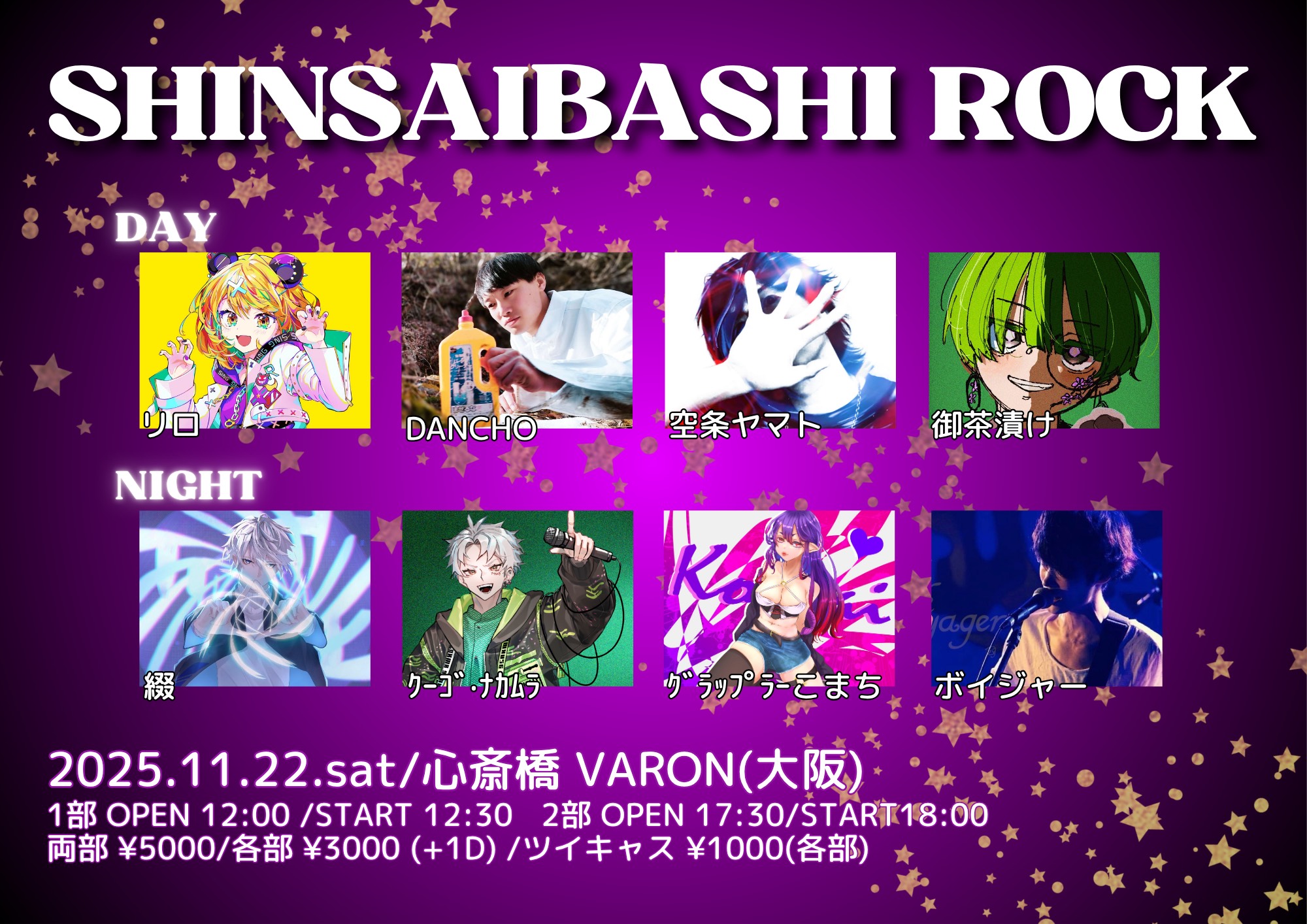 心斎橋 VARON(ヴァロン) スケジュール 2025.11.22(Sat) SHINSAIBASHI ROCK [ACT] [DAY] / リロ / DANCHO / 空条ヤマト / 御茶漬け / [NIGHT] / 綴 / クーゴ・ナカムラ / グラップラーこまち / ボイジャー [OPEN/START] [1部] 12:00/12:30 / [2部] 17:30/18:00 [料金] 両部 ¥5,000(各部1D別) / 各部¥3,000 (1D別) / ツイキャス各部¥1,000 (問)心斎橋VARON 06-6243-1400 / info@osaka-varon.jp (主催)ヨヒラ/よもぎ