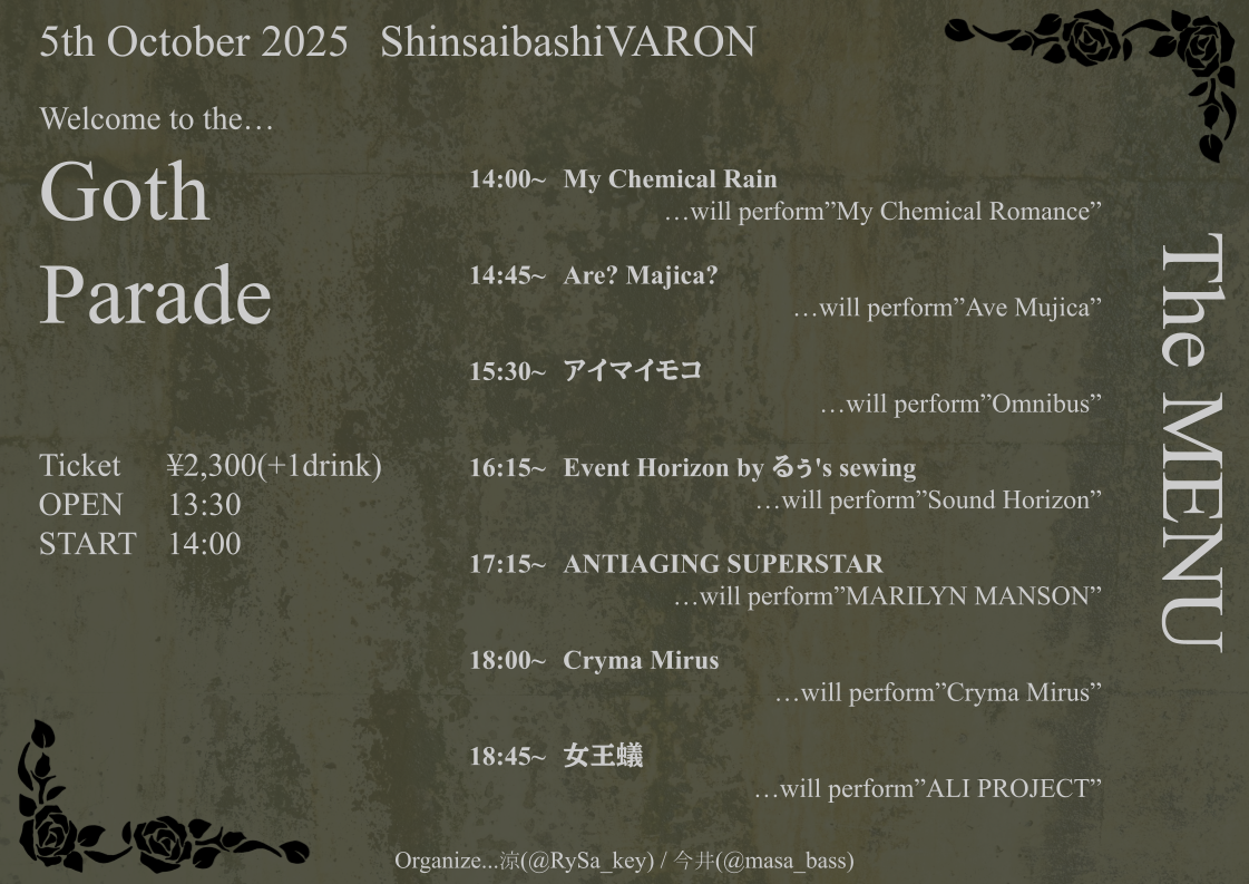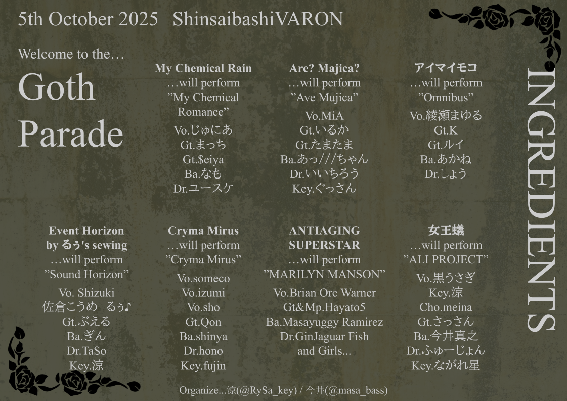 心斎橋 VARON(ヴァロン) スケジュール 2025.10.05(Sun) Welcome to the…GothParade [ACT] My Chemical Rain / Are? Majica? / アイマイモコ / Event Horizon by るぅ's sewing / ANTIAGING SUPERSTAR / Cryma Mirus / 女王蟻 [OPEN/START] 13:30/14:00 [料金] ¥2,300(1D別) (問)心斎橋VARON 06-6243-1400 / info@osaka-varon.jp