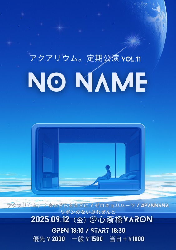 心斎橋 VARON(ヴァロン) スケジュール 2025.9.12(Fri) アクアリウム。定期公演vol.11「no name」 [ACT] アクアリウム。 / あおぞらをキミに / #PANnana / ゼロキョリハーツ / リボンのないぷれぜんと [OPEN/START] 18:10/18:30 [料金] 優先 ¥2,000 / 一般 ¥1,500 (+1D) ※当日券は各+¥1,000(1D別) (問)心斎橋VARON 06-6243-1400 / info@osaka-varon.jp チケットURL →https://t.livepocket.jp/e/ns5vt