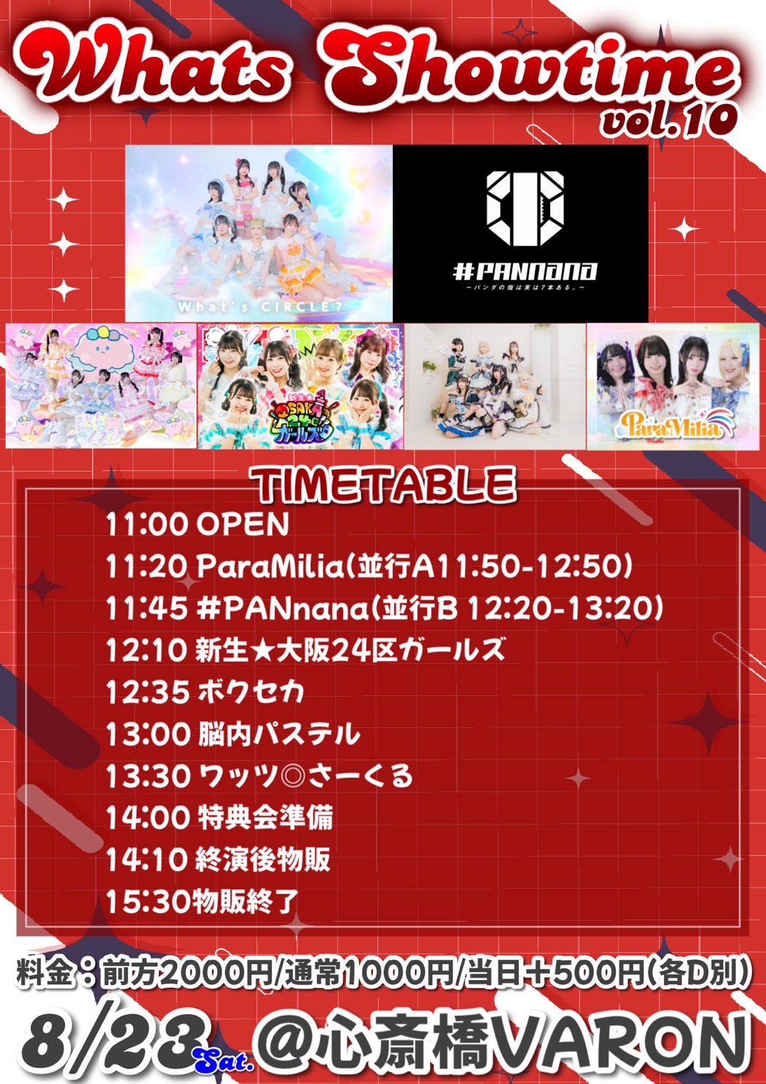 心斎橋 VARON(ヴァロン) スケジュール 2025.8.23(Sat) 「Whats Showtime vol.10」 [ACT] ワッツ◎さーくる / #PANnana / ボクセカ / ParaMilia / 脳内パステル / 新生★大阪24区ガールズ [OPEN/START] 11:00/11:20 [料金] 前方2000円 /通常1000円 / 当日+500円(各D代別) (問)心斎橋VARON 06-6243-1400 / info@osaka-varon.jp チケット →https://t.livepocket.jp/e/varon0823