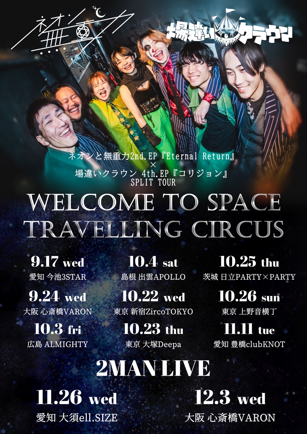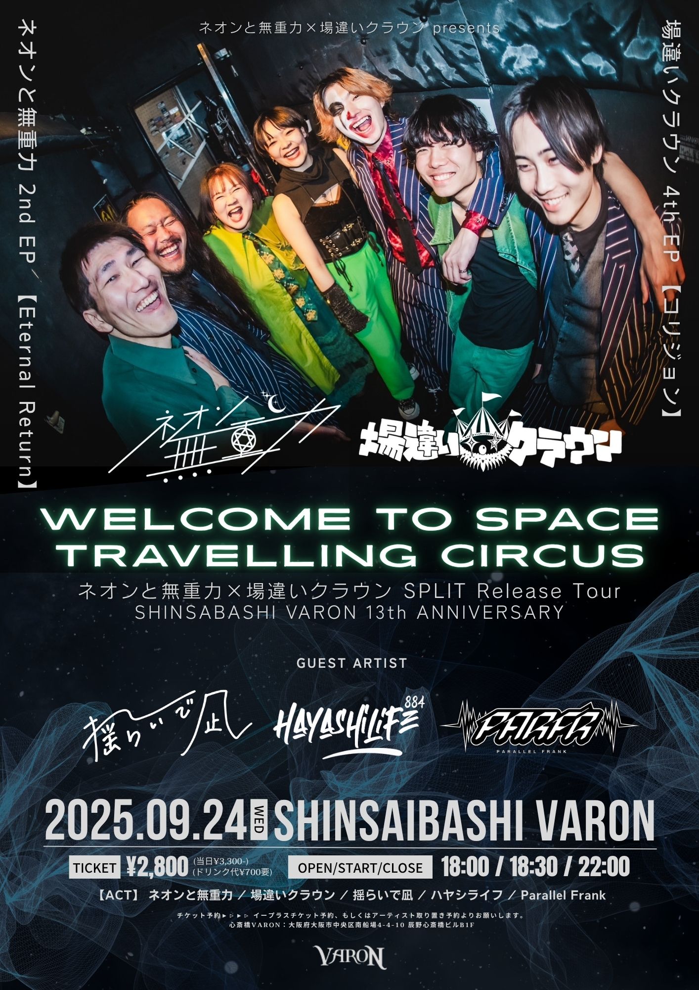 心斎橋 VARON(ヴァロン) スケジュール 2025.9.24(Wed) ネオンと無重力×場違いクラウン pre. Welcome to space travelling circus ネオンと無重力×場違いクラウン SPLIT Release Tour SHINSAIBASHI VARON 13th ANNIVERSARY!! [ACT] ネオンと無重力 / 場違いクラウン / 揺らいで凪 / ハヤシライフ / Parallel Frank [OPEN/START] 18:00/18:30 [料金] 前売り2800円 / 当日3300円 (1D別) (問)心斎橋VARON 06-6243-1400 / info@osaka-varon.jp