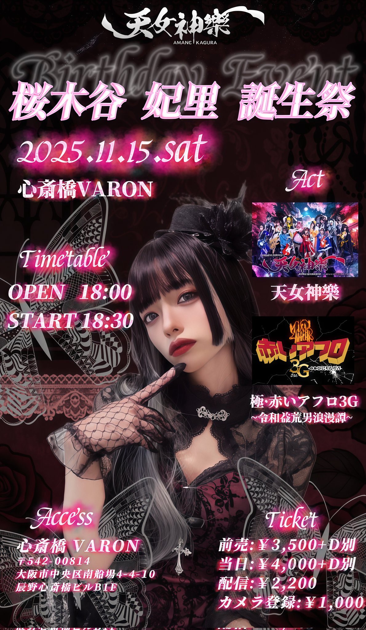 心斎橋 VARON(ヴァロン) スケジュール 2025.11.15(Sat) 天女神樂 桜木谷妃里生誕祭2025 [ACT] 天女神樂 / 極・赤いアフロ3G~令和益荒男浪漫譚~ [OPEN/START] 18:00/18:30 [料金] 前売り¥3,500 / 当日¥4,000(各1D別) 配信¥2,200 / カメラ登録料¥1,000 (問)心斎橋VARON 06-6243-1400 / info@osaka-varon.jp チケットはこちら↓ t.livepocket.jp/e/amanekagura20251115 出演演者:Vo.杏、Dr.桜木谷妃里、Gt.星井葵、Ba.酒呑紫、Gt.巫波瑠、Key.胡桃莉咲、Ba.神代千夏、Dr.小鳥遊華恋、Gt.御影万璃、Ba.御伽熊猫、Dr.鳴海旭、Gt.不動豹雅(門下生) A.Live Pocket B.当日券 入場順:A→B