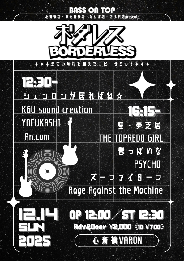 心斎橋 VARON(ヴァロン) スケジュール 2025.12.14(Sun) BASS ON TOP pre. コピーサミット「ボダレス BORDERLESS」 [ACT] シェンロンが居ればね☆ / KGU sound creation / YOFUKASHI / An.com / 座・夢芝居 / THE TOPREDO GIRL / 鬱っぽいな / PSYCHO / ズーファイターフ / Rage Against the Machine(魂) [OPEN/START] 12:00/12:30 [料金] Adv&Door ¥2,000- (1D¥700-) (問)心斎橋VARON 06-6243-1400 / info@osaka-varon.jp