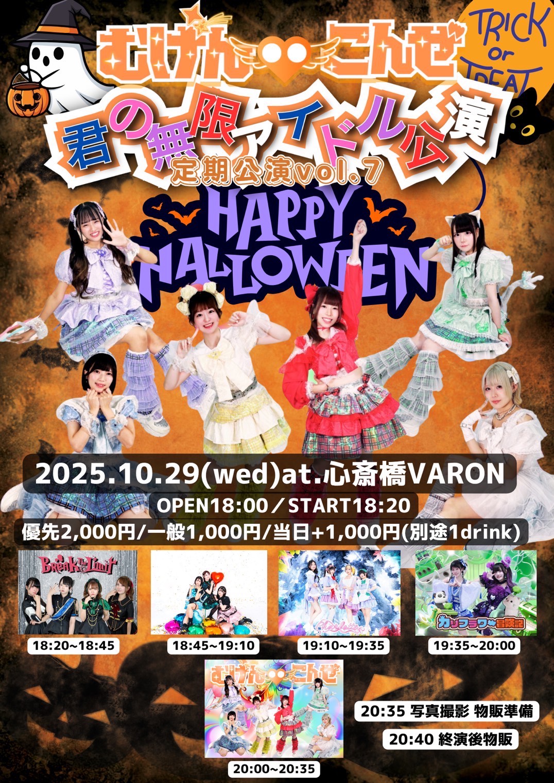 心斎橋 VARON(ヴァロン) スケジュール 2025.10.29(Wed) むげんこんぜ定期公演vol.7"君の無限アイドル公演" [ACT] むげんこんぜ / カリフラワー冒険記 / Charlotte / マイフェアガ→ル / BreakTheLimit [OPEN/START] 18:00/18:20 [料金] 優先エリア 2000円 / 一般 1000円(1D700円別) (問)心斎橋VARON 06-6243-1400 / info@osaka-varon.jp チケット →https://ticketdive.com/event/MugenKonzeVol7