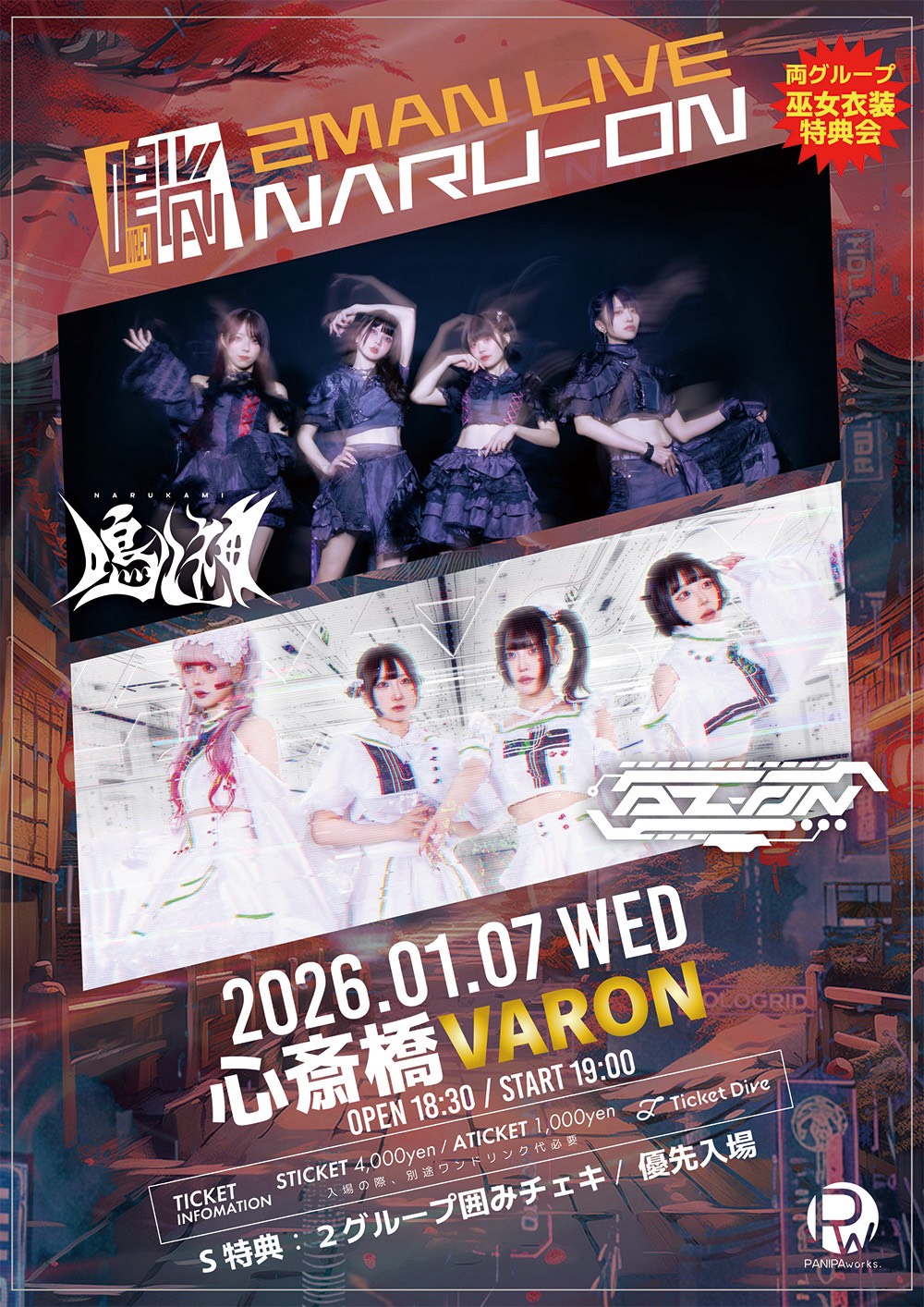 心斎橋 VARON(ヴァロン) スケジュール 2026.1.07(Wed) 鳴ル-ON 新春SP [ACT] AZ-ON / 鳴ル神 [OPEN/START] 18:30/19:00 [料金] Sチケット ¥4,000 / Aチケット ¥1,000 (各1D別途必要) (問)心斎橋VARON 06-6243-1400 / info@osaka-varon.jp Ticket Dive https://t-dv.com/naru-on_260107