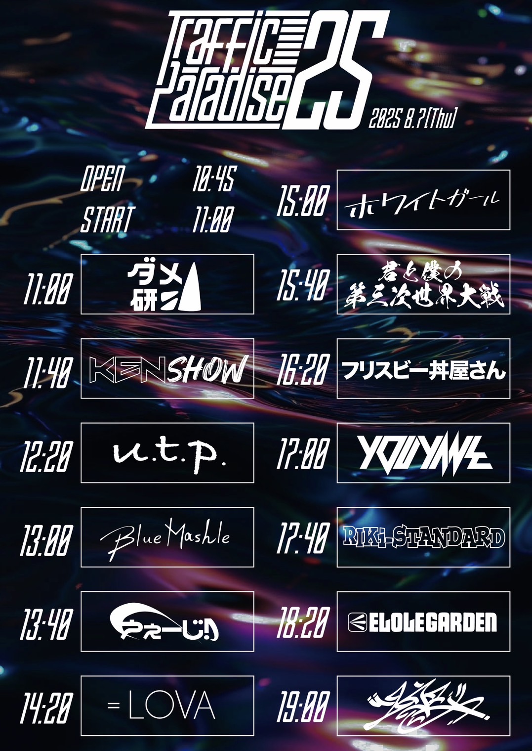 心斎橋 VARON(ヴァロン) スケジュール 2025.8.07(Thu) Traffic Paradise [ACT] ダメ研 / KENSHOW / u.t.p. / Blue Mashle / えぇーじ! / =LOVA / ホワイトガール / 君と僕の第三次世界大戦 / フリスビー丼屋さん / YOUYANE / RIKi-STANDARD / ELOLEGARDEN / 2JZ [OPEN/START] 10:45 / 11:00 [料金] 1D Only (問)心斎橋VARON 06-6243-1400 / info@osaka-varon.jp