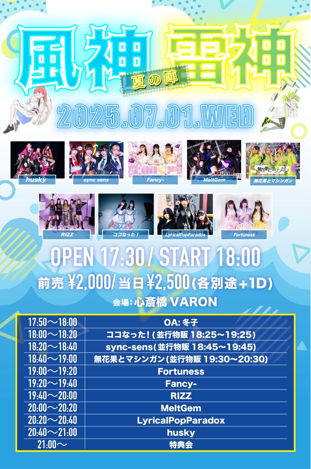 心斎橋 VARON(ヴァロン) スケジュール 2025.7.01(Tue) 風神雷神 夏の陣 [ACT] husky / sync-sens / Fancy- / MeltGem / 無花果とマシンガン / RIZZ / ココなった! / LyricalPopParadox / Fortuness [OPEN/START] 17:30/18:00 [料金] 前売:¥2000 当日:¥2500 (1D別) (問)心斎橋VARON 06-6243-1400 / info@osaka-varon.jp 予約フォーム https://tiget.net/events/408101